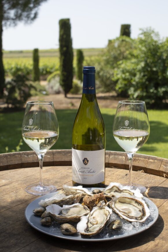 In the heart of the Languedoc, Domaine de Saint André, with an area of 40 hectares on a single block of land, boasts the full set of traditional Languedoc grape varieties (Cinsault, Carignan, Chardonnay, Muscat, Roussanne, Vermentino and Viognier), supplemented by some Bordeaux varieties (Merlot and Cabernet Franc). The terroir is predominantly clay and limestone. Since purchasing the estate in 2002, Inès and Thierry Hébert have sought to rejuvenate this estate that belonged to the same family for two hundred years. Knowledgeable about the winemaking process with the advice of their winemaker Jean-François Vrinat and in collaboration with the estate manager, their efforts have contributed to the production of fine wines that appeal to both national and international customers.