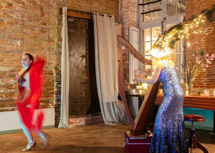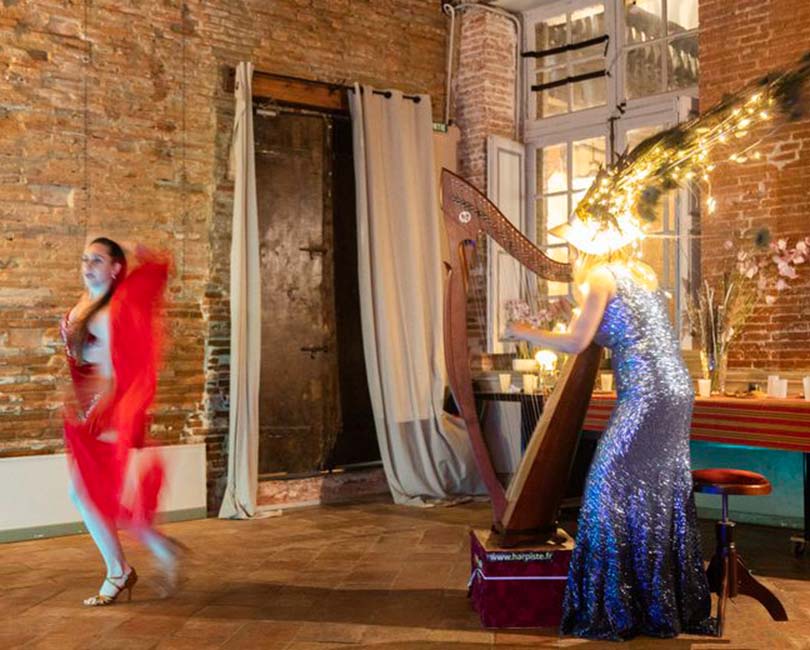 Accompanied by the mysterious dancer, Gabrielle plays her harp with a unique sensitivity, mixing Celtic, classical and modern tunes. Each note vibrates in this setting of stone and light, each dance movement an extension of the melody, creating a spellbinding harmony where poetry comes to life before your very eyes.