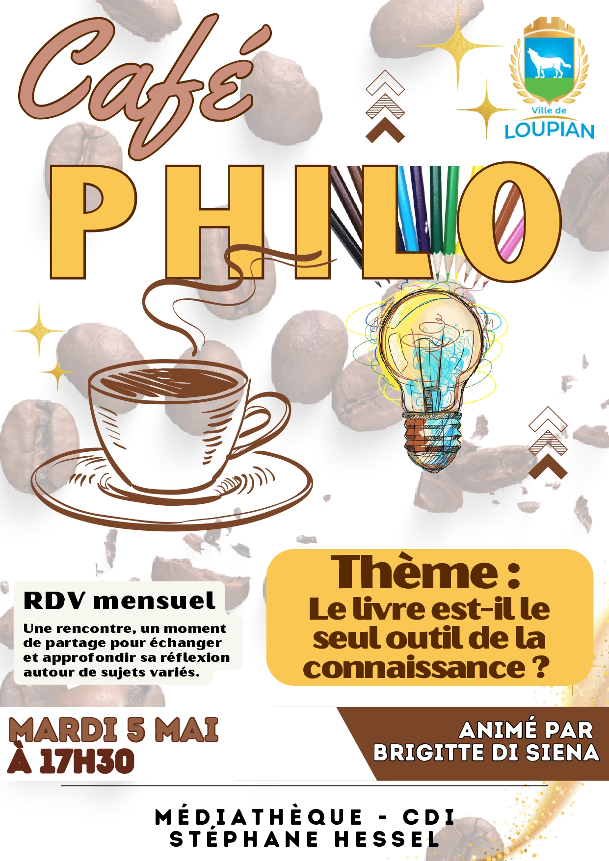 Créé en octobre 2023 par Brigitte DI SIENA, le café-philo a vocation à sortir la philosophie de son contexte universitaire. Il permet à chacun d’approfondir sa réflexion, de développer son esprit critique et de susciter l’étonnement philosophique pour une meilleure coopération intellectuelle.Thème du mois : Le livre est-il le seul outil de la connaissance ?