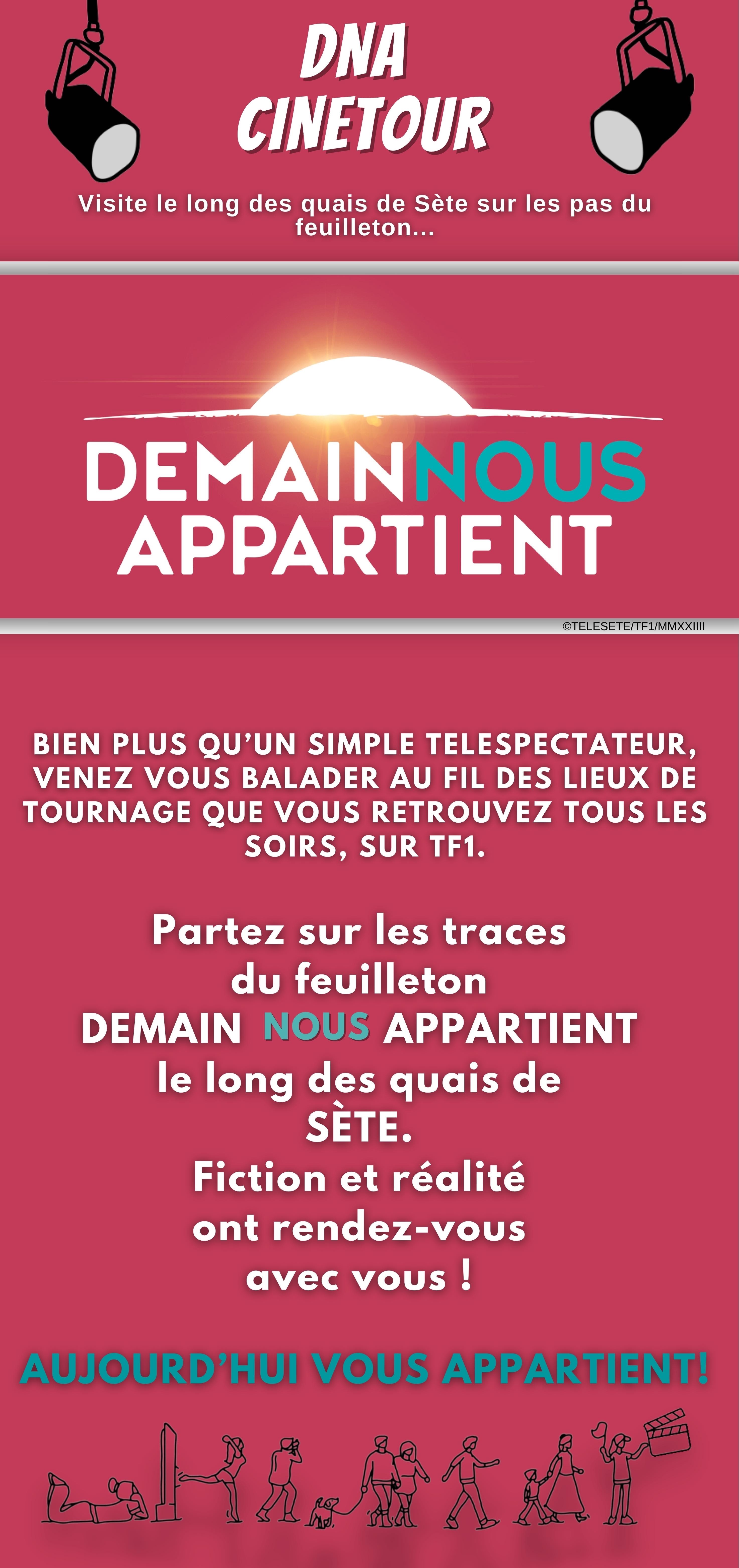 Fiction, reality, clues, culture, anecdotes and good humor all come together for a walking CINETOUR! Follow in the footsteps of the series DEMAIN NOUS APPARTIENT through SÈTE.Much more than just a TELESPECTOR, come and investigate and learn about the EMBLEMATED places you’ll find every evening on TF1.CINETOUR led by a professional actor. All year round, regular departures available on reservation.Meeting point 6 quai Aspirant Herbert (opposite the Spoon) and end of the tour in the Pointe Courte district.Walking tour lasting approx. 1h50, please bring comfortable shoes.Tour starts from 6 people.In case of bad weather: except in the event of a red alert, the tour will be maintained, please bring suitable clothing.However, in the event of extremely unfavorable weather conditions at the time of departure, the guide reserves the right to cancel the tour at the last minute onlyspecial conditions: Minors must be accompanied by an adult.Children up to 3 years of age are admitted free of charge (with a ticket issued); if your child does not present a free ticket, you will be required to purchase a ticket at the rate of 18? at the time of departure.The studios are open to film crews only, and Cinetours do not include interviews with DNA actors.