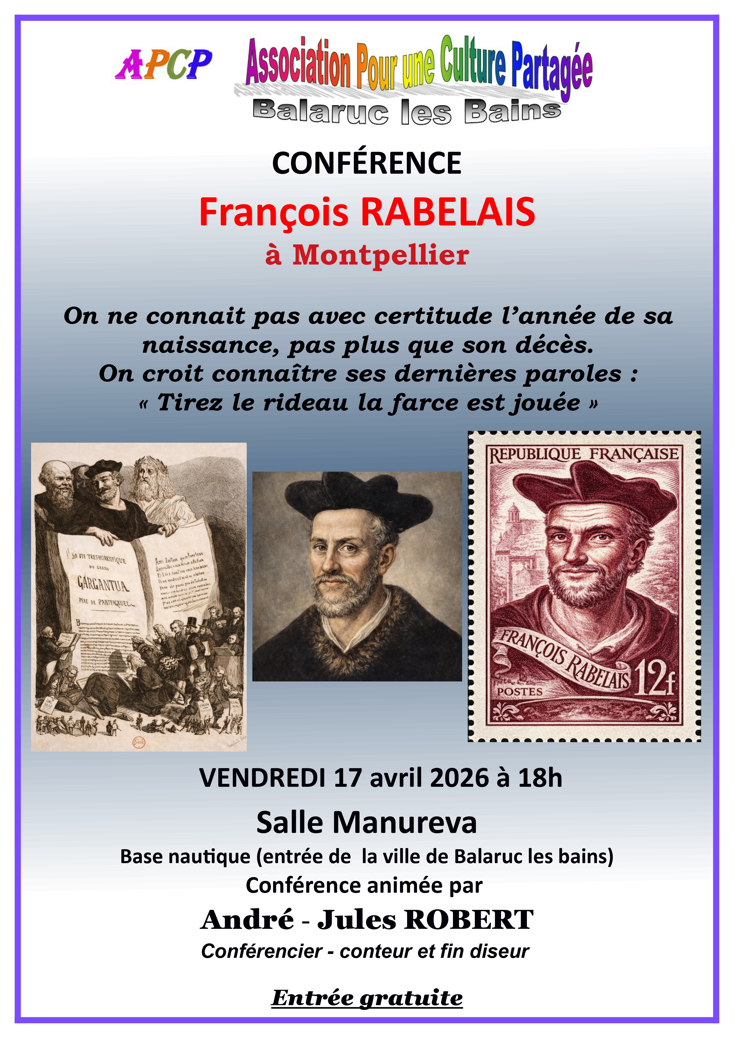 Conférence animée par André-Jules Robert, proposée par l’APCPL’École de médecine de Montpellier compte nombre d’étudiants devenus célèbres, souvent pour leurs talents de médecin, parfois pour d’autres raisons : outre les nombreux médecins des papes d’Avignon comme Arnaud de Villeneuve ou Gui de Chauliac, puis ceux des rois de France comme André Du Laurens, Jean Héroard ou Jean Astruc, on pense à Théophraste Renaudot, Nostradamus, Théophile de Bordeu… Sans conteste, le plus fameux d’entre eux reste cependant François Rabelais.Lors de ses deux séjours à Montpellier, de 1530 à 1532 puis de 1537 à 1538, il prend tous ses grades de médecin : baccalauréat, licence puis doctorat, titre dont il est particulièrement fier et qu’il ajoute à systématiquement à sa signature après 1537. Il donne également des cours et préside à au moins une dissection anatomique ; il noue des amitiés solides avec ses camarades et professeurs de l’École de médecine comme avec les humanistes de la ville ; et ses œuvres témoignent largement, quoique indirectement, de cette importante partie de sa vie.