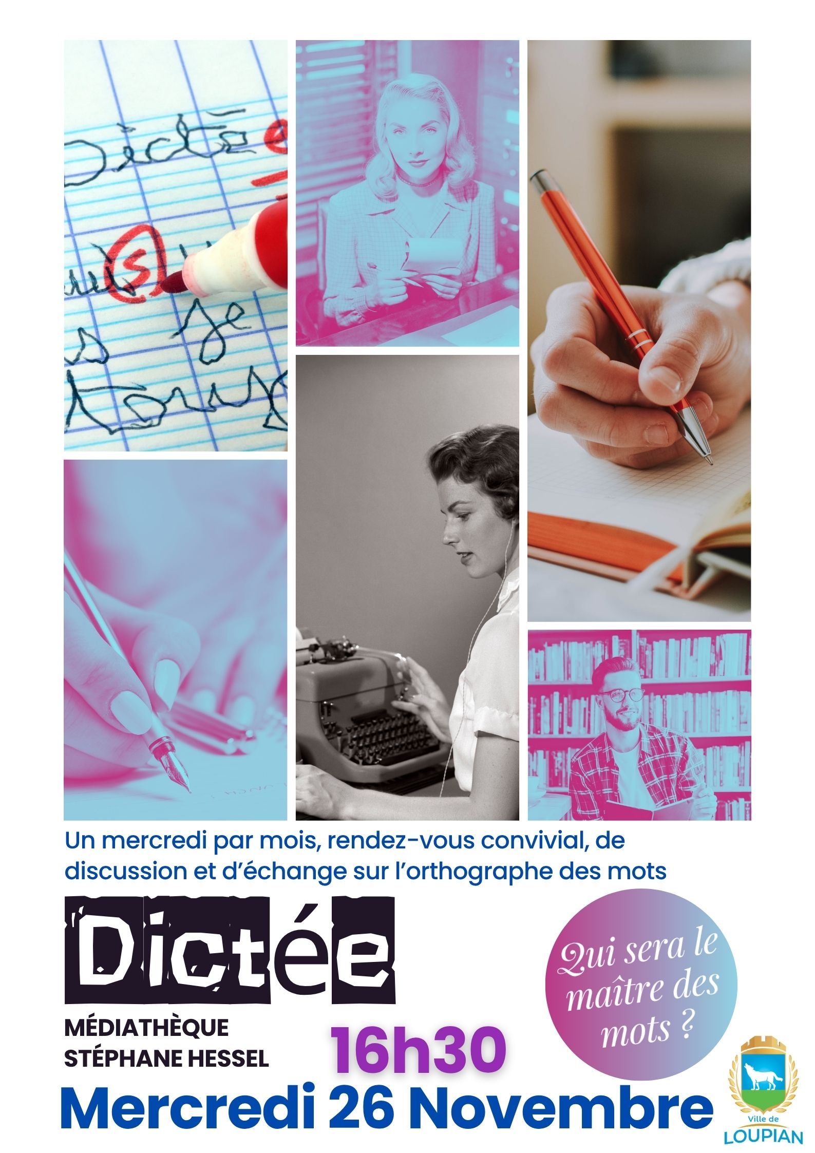 Découvrez la dictée des bénévoles de la médiathèque, simple et ludique à l’occasion de ce rendez-vous mensuel.Moment de convivialité, de discussion et d’échange sur l’orthographe des mots.Alors, qui sera le maître des mots?