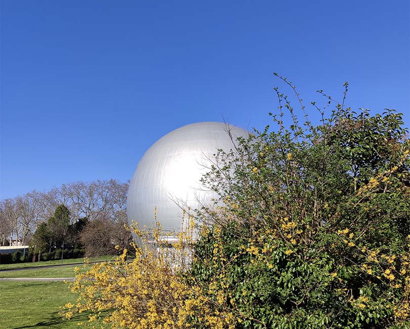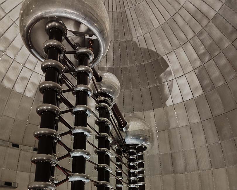 Pour arriver à une telle puissance (1.5 millions de volts), la colonne du microscope (disparue depuis) était alimentée par un accélérateur de type Cockcroft-Walton. A l’époque, les instruments sont de taille monumentale : c’est la “Big Science” ! C’est là, que vos yeux s’écarquillent : la “Boule” de 26 mètres de diamètre de l’architecte Camille Montagné abrite encore cet accélérateur. Il se compose de tubes surmontés de champignons d’acier poli de 9 mètres de haut, mais chut…il faut le voir pour le croire…