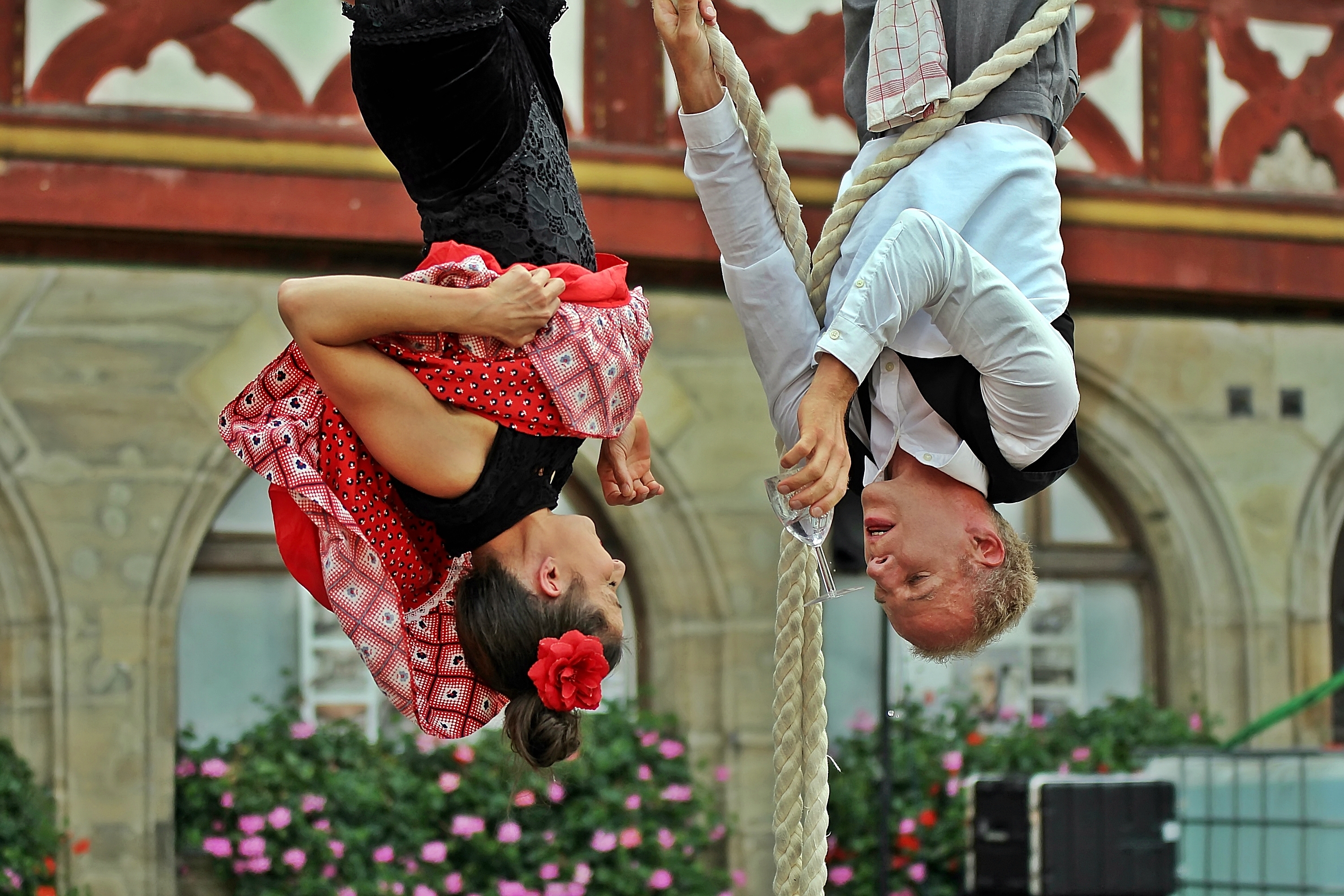 “Le Bistro” est le nom d’un ancien restaurant ayant connu des jours meilleurs. À la fermeture, un serveur mal embouché rencontre une dame fantasque. Le bistrot devient alors un terrain de jeu où les conflits se déchaînent et les talents s’expriment avec excentricité, le tout rythmé par le swing. En mêlant théâtre et acrobatie, Esther et Jonas créent des histoires et des personnages inspirés de la vie réelle — familiers, adorés ou détestés. En résumé, un spectacle de rue vraiment unique.