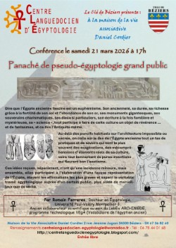 Cette conférence, animée par Romain Ferreres, Docteur en Égyptologie de l’Université Paul-Valéry Montpellier 3, et ancien collaborateur scientifique au sein du LabEx ARCHIMEDE, propose un panaché de pseudo-égyptologie grand public. Elle explore la fascination pour l’Égypte ancienne, sa richesse, ses monuments gigantesques, ses souverains charismatiques, ses dieux particuliers, son écriture et les fantasmes. La présentation aborde également les déductions et les savoirs qui sont le plus souvent des exagérations, des mécompréhensions d’éléments réels de sa culture, ainsi que les bonnes et mauvaises interprétations. L’objectif est de démêler le vrai du faux dans la représentation de l’Égypte.