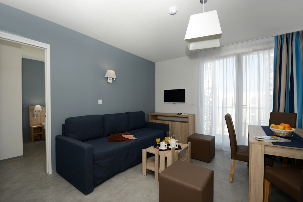 Profitez des multiples possibilités et prestations de cette résidence dont le design se joue des privilèges méditerranéens, pour une ou plusieurs nuits en appart’hôtel ou pour un séjour en location d’appartement ou de villa, à 150 m de la plage.
