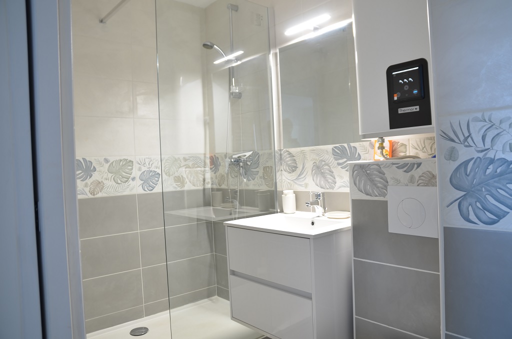 New bathroom with energy-saving water heater.