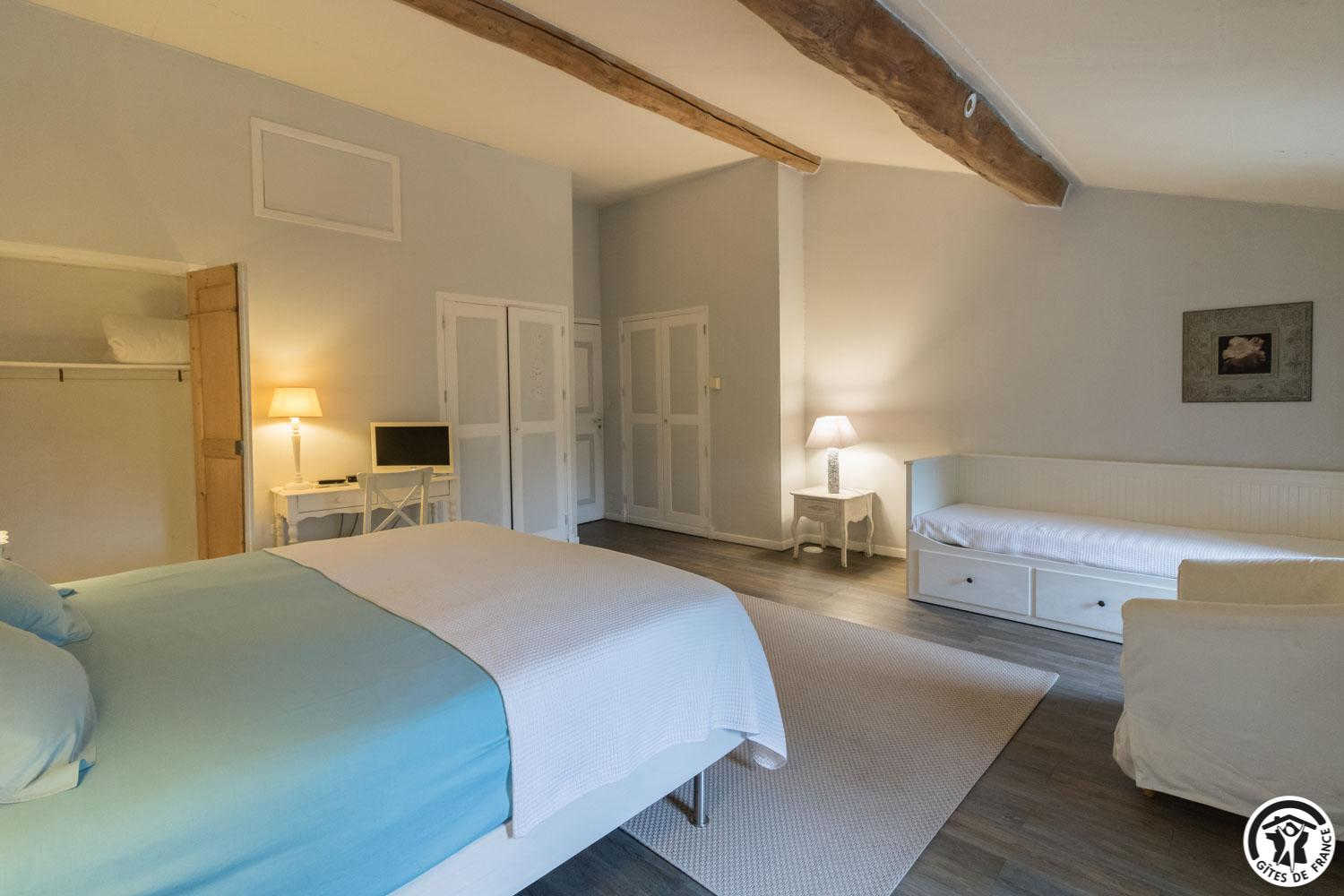 – upstairs: 4 non-smoking bedrooms (accessible via 2 staircases): “Goya” (1 x 160cm double bed), “Pastel” (2 x 90cm single beds that can be twinned to form 1 x 180cm double bed), Hedwige (2 x 90cm single beds that can be twinned to form 1 x 180cm double bed + 2 x 80cm single beds including 1 drawer) and Ingres (2 x 90cm single beds) (1 x 160cm double bed).