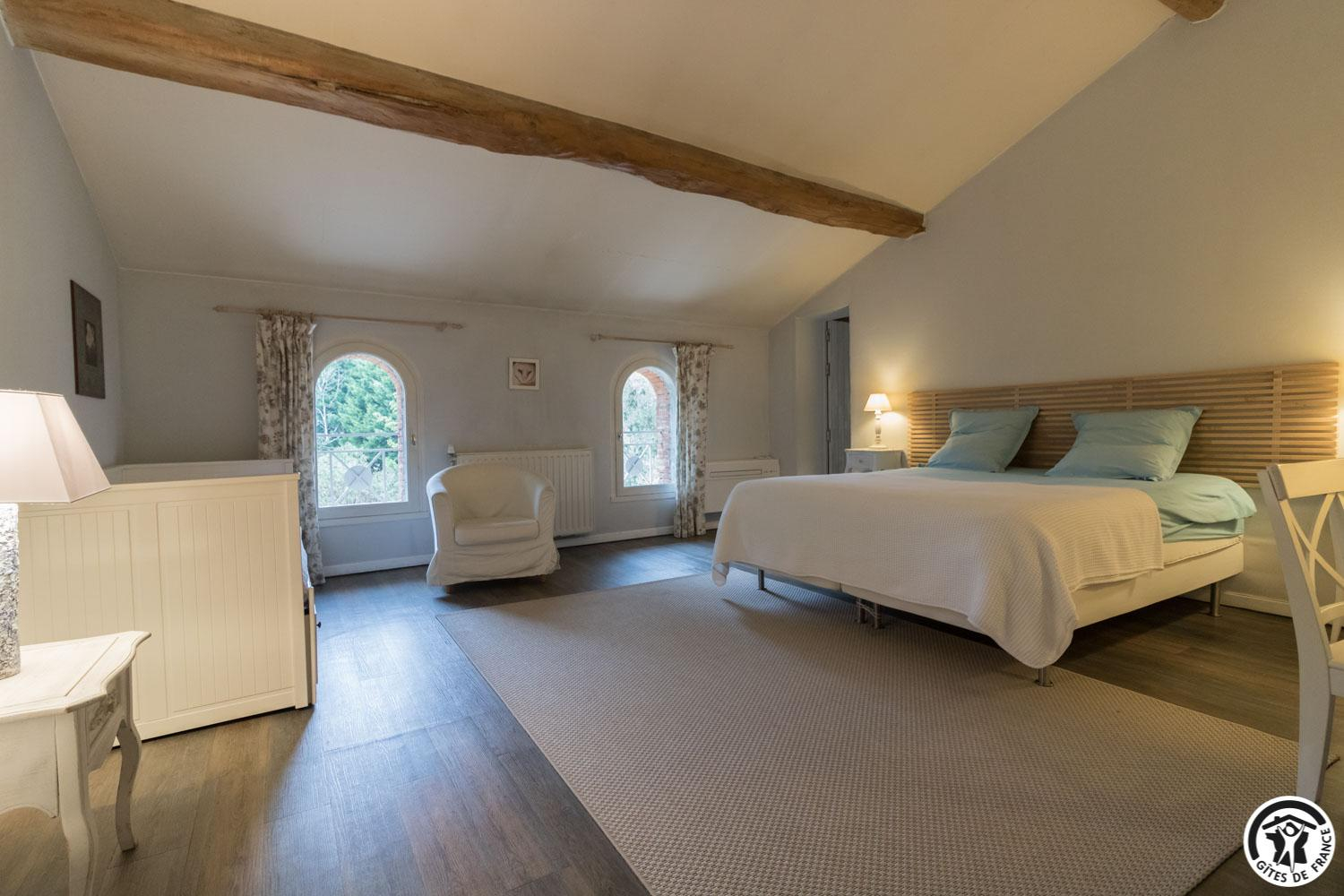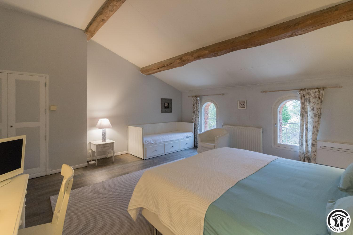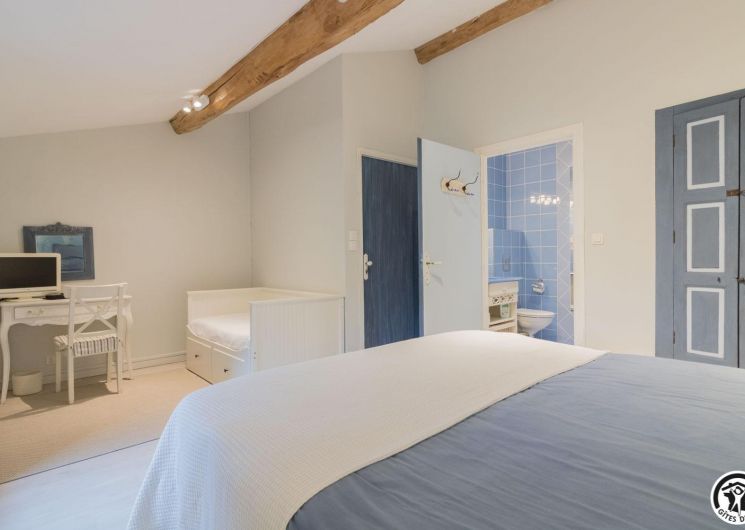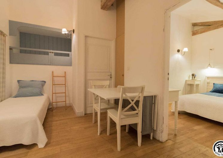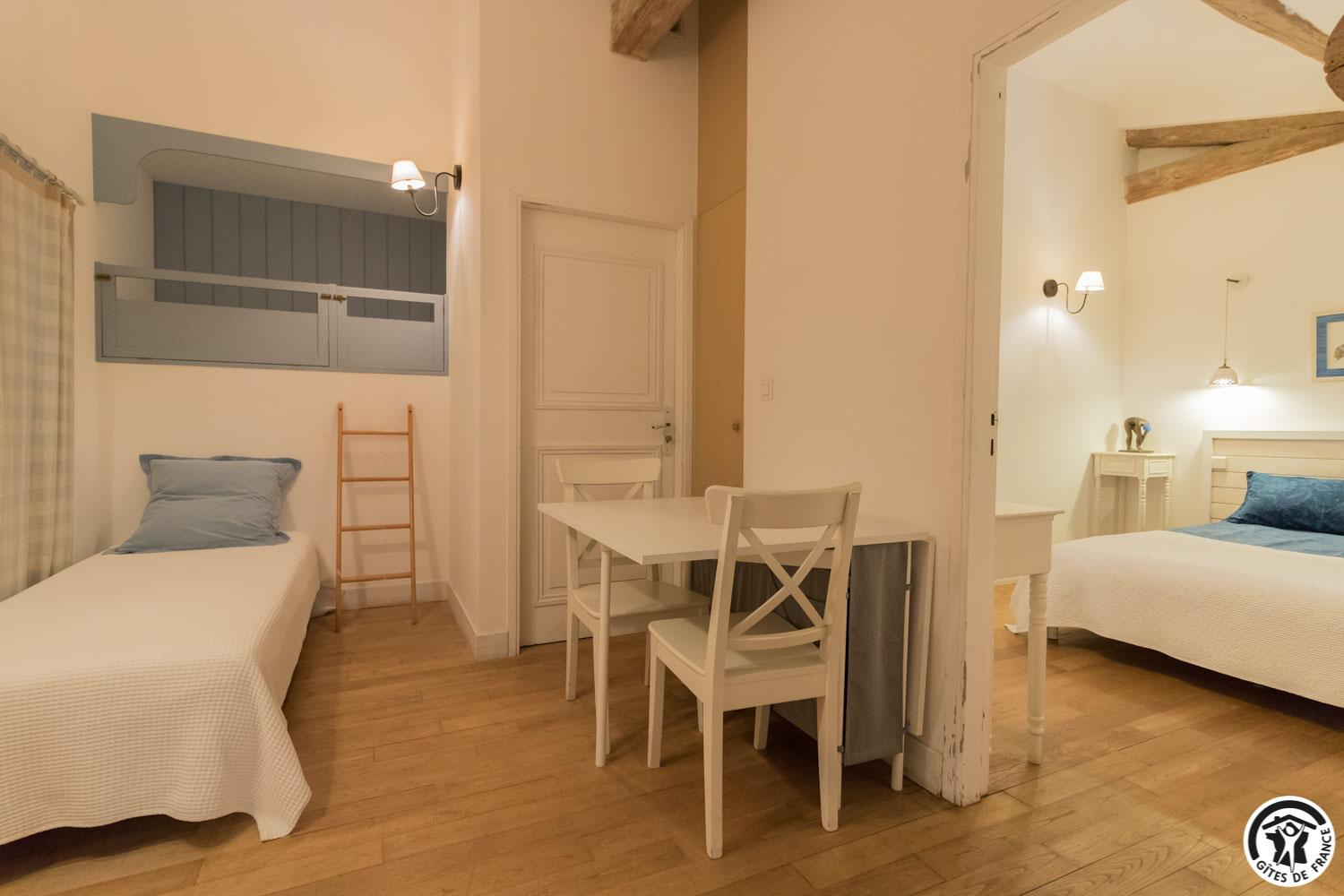 – upstairs: 4 non-smoking bedrooms (accessible via 2 staircases): “Goya” (1 x 160cm double bed), “Pastel” (2 x 90cm single beds that can be twinned to form 1 x 180cm double bed), Hedwige (2 x 90cm single beds that can be twinned to form 1 x 180cm double bed + 2 x 80cm single beds including 1 drawer) and Ingres (2 x 90cm single beds) (1 x 160cm double bed).