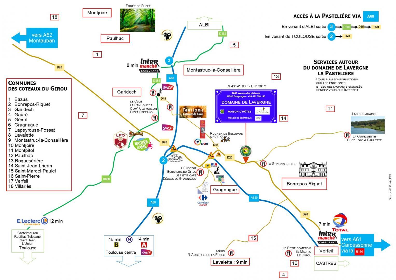 The village of Gragnague is 2 km away (shops and restaurants). There are many sites to discover nearby: the Château de Bonrepos-Riquet (formerly owned by the designer of the Canal du Midi, Pierre-Paul Riquet) and the Graougnou equestrian centre are 3km away, the Natura Game leisure park is 5km away, the Cathar town of Verfeil is 6km away, the Calicéo fitness and well-being centre and the Buzet-sur-Tarn forest (golf and walking) are 13km away, and Toulouse city centre is 20km (metro station line B – Balma-Gramont is 15km away). You’re also at the gateway to the Tarn department: Gaillac is 45km away, Albi is 64km and Cordes-sur-Ciel is 70km.