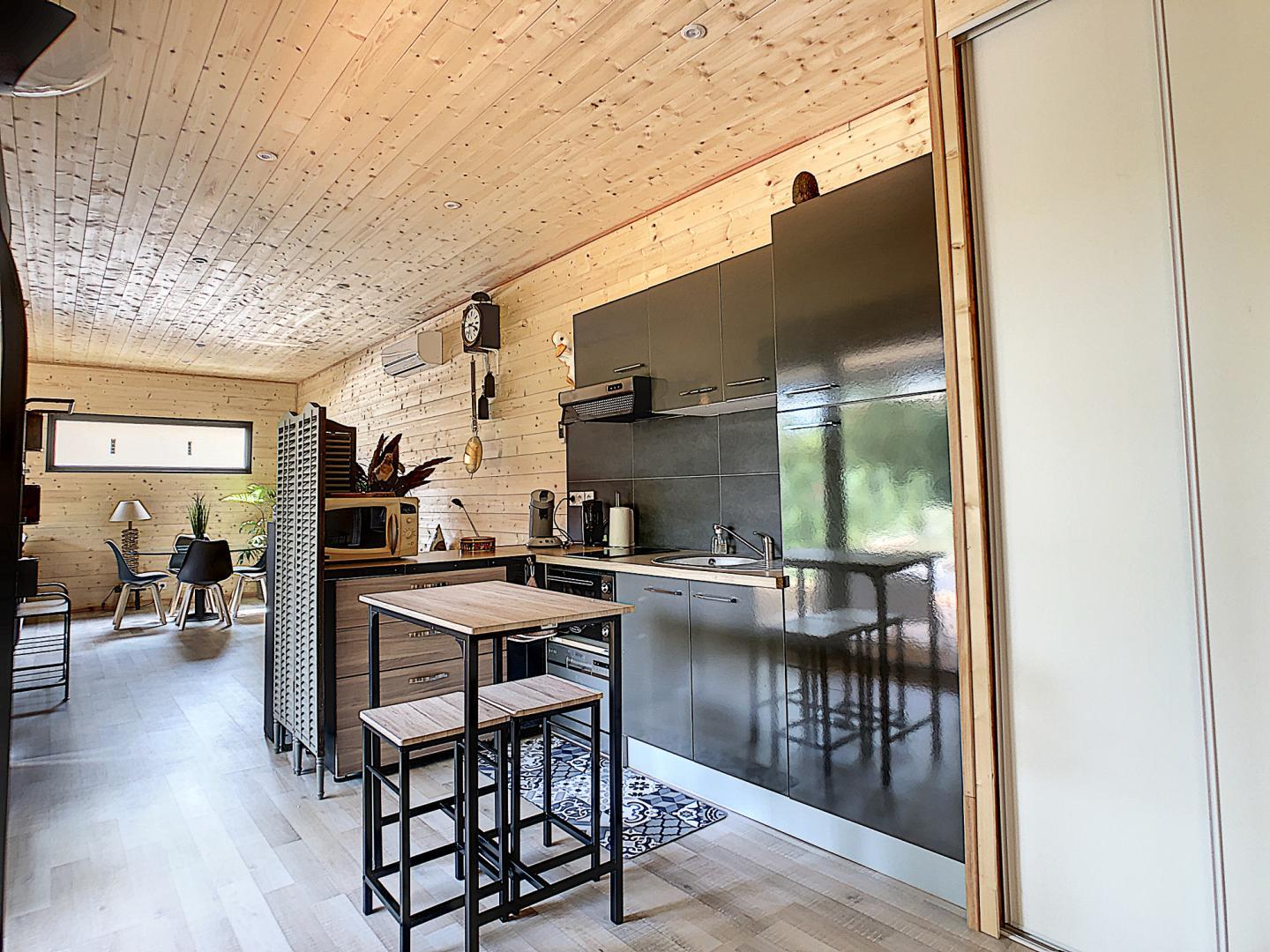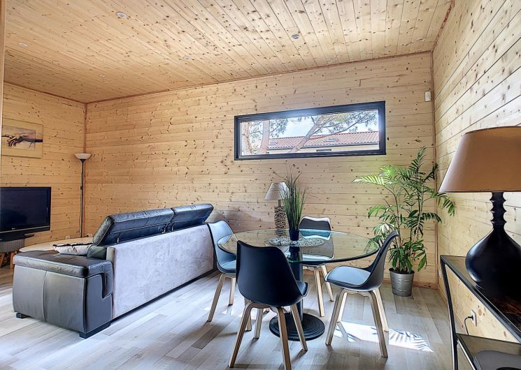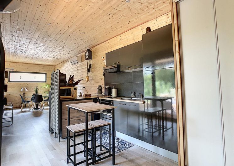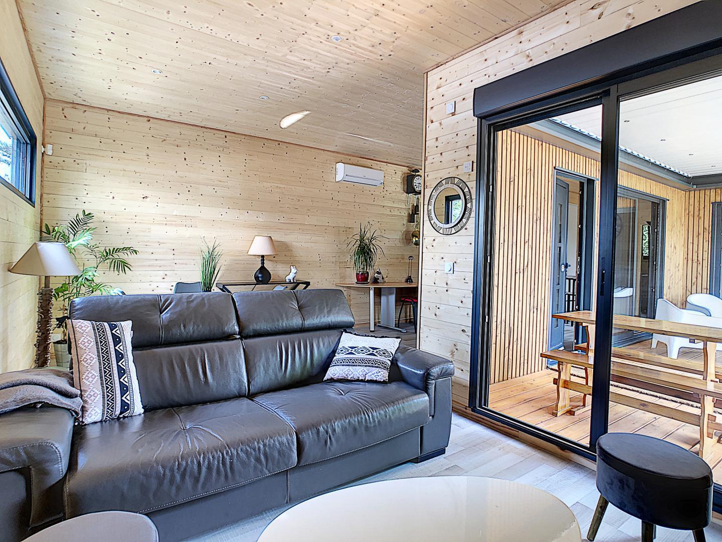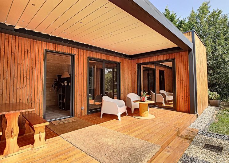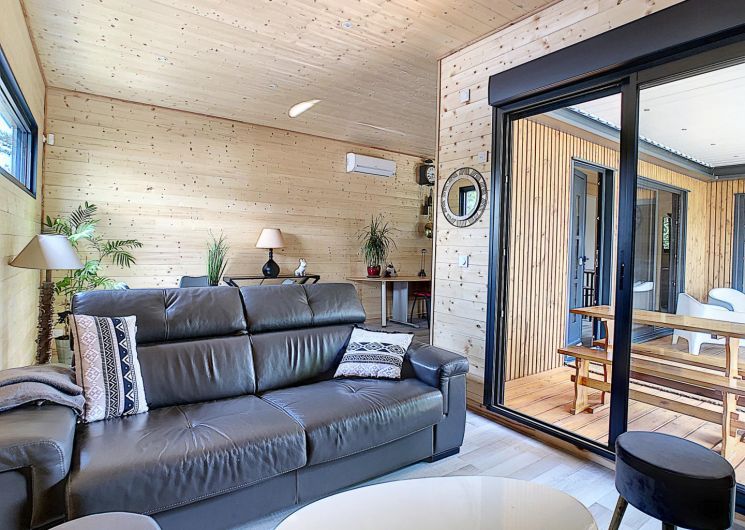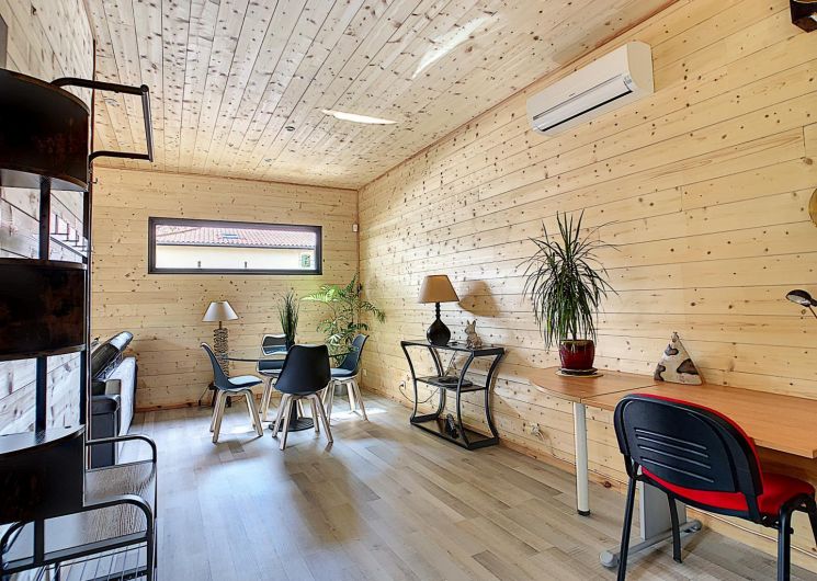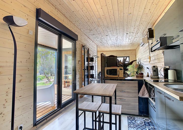 This very bright gîte is on one level (the gîte is designed in a U shape around its bio-climatic terrace): entrance to the study area and open-plan kitchen, living room in one of the wings of the U with dining area and lounge (sofa bed). The other wing of the U houses the bedroom (1 double bed 160x200cm) and the shower room/WC. Reversible air conditioning. Wifi internet connection (fibre). Non-smoking gîte.