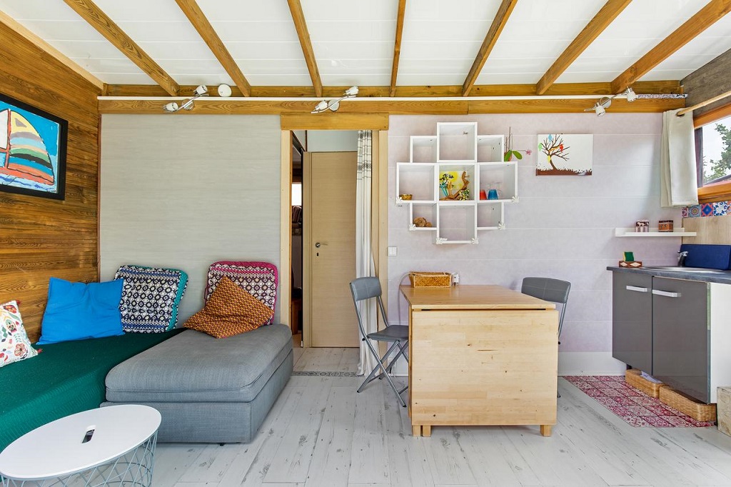 A fully-equipped wooden chalet, one bedroom with double bed.