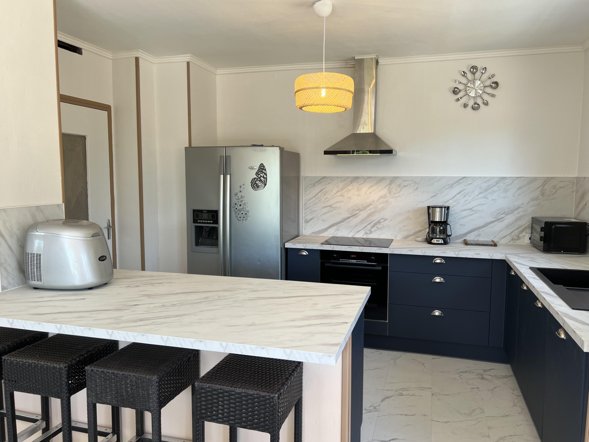 Espace de vie : salon, salle à manger et cuisine ouverte entièrement équipée (four, micro-ondes, lave-vaisselle, cafetière, réfrigérateur, congélateur…).