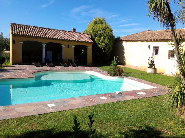 Magnifique villa avec jardin de 3000 m2, dans un quartier tranquille de Villeneuve-lès-Béziers, non loin de la mer, piscine (10×8 m), poolhouse (avec wc) entièrement couvert, parking devant la maison, terrain clos.