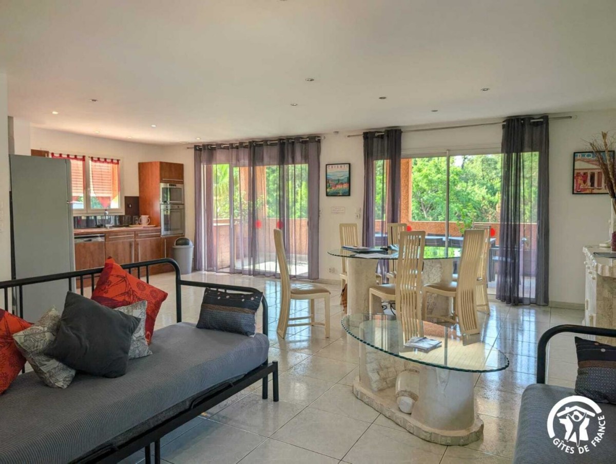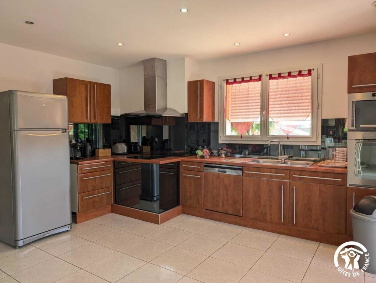 – A large living room with fully-equipped open kitchen (hob, fridge, oven, microwave, nespresso coffee maker, toaster, kettle, dishwasher, washing machine), bay window opening onto a large covered terrace with table and chairs.