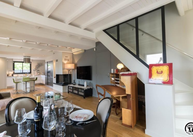Its vast, light-filled living room features a fully-equipped fitted kitchen and opens onto a sitting area and office space, ideal for teleworking or preparing excursions. One bedroom (1 x 90*200cm bed and 1 x 90*200cm pull-out bed) on the ground floor offers perfect accessibility, while upstairs, two bedrooms (each with 1 x 160*200cm bed, one with TV) decorated with refinement invite you to relax. The bathroom, equipped with a bath and shower, guarantees you moments of relaxation after your escapades. Reversible air conditioning in every room. You cannot use the fireplace.