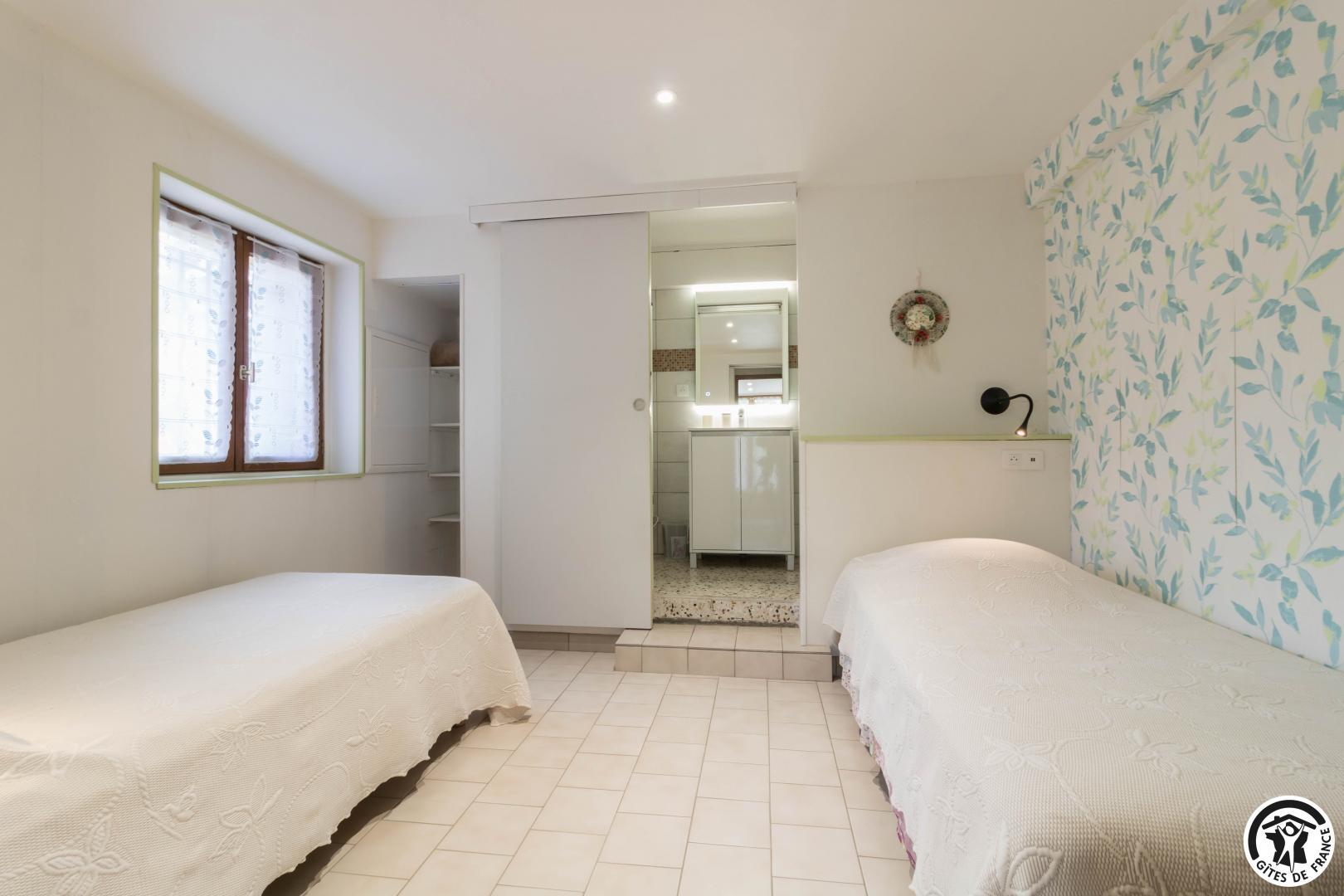 On the ground floor of the owner’s house, accessible from the outside, this family room offers 2 separate bedrooms (4 single beds, 2 of which can be twinned), each with its own shower room/WC. One of the bedrooms has a desk. Breakfast will be served in the living room (lounge area, dining area and fitted kitchen), which is itself accessible to holidaymakers. Outside, you can relax on the terrace and in the garden.