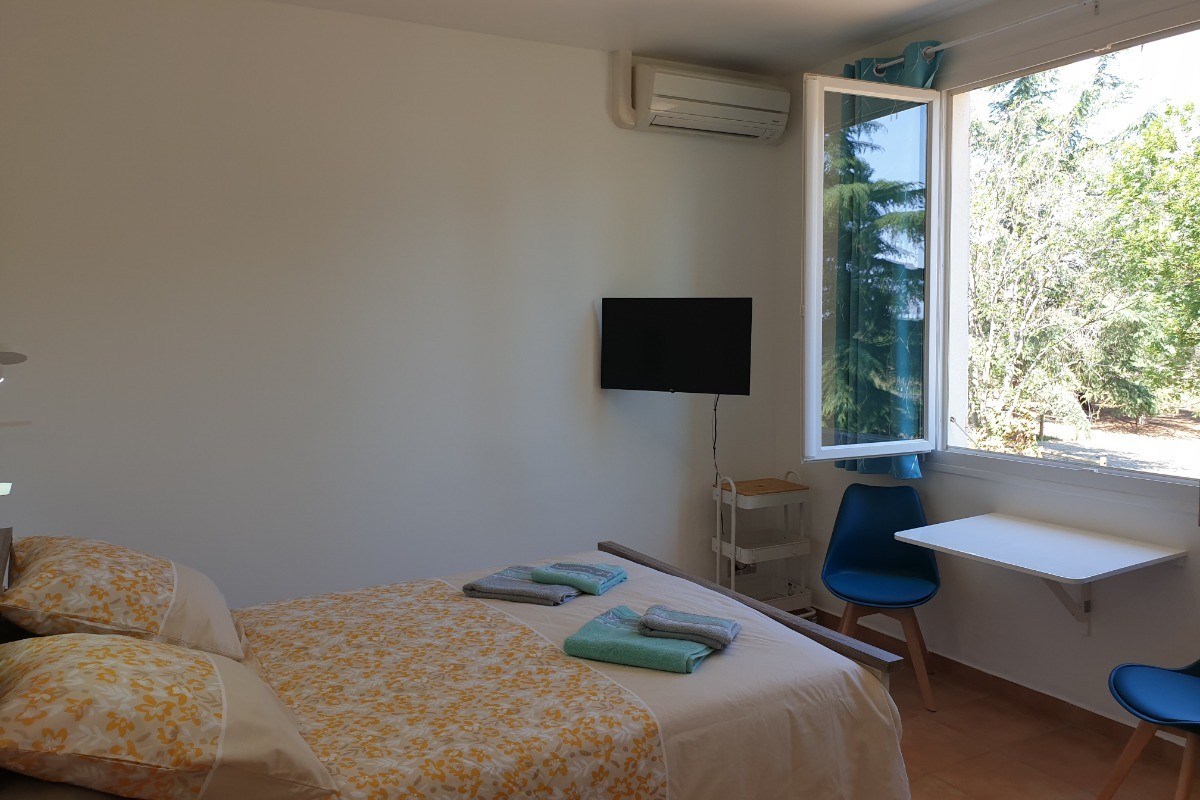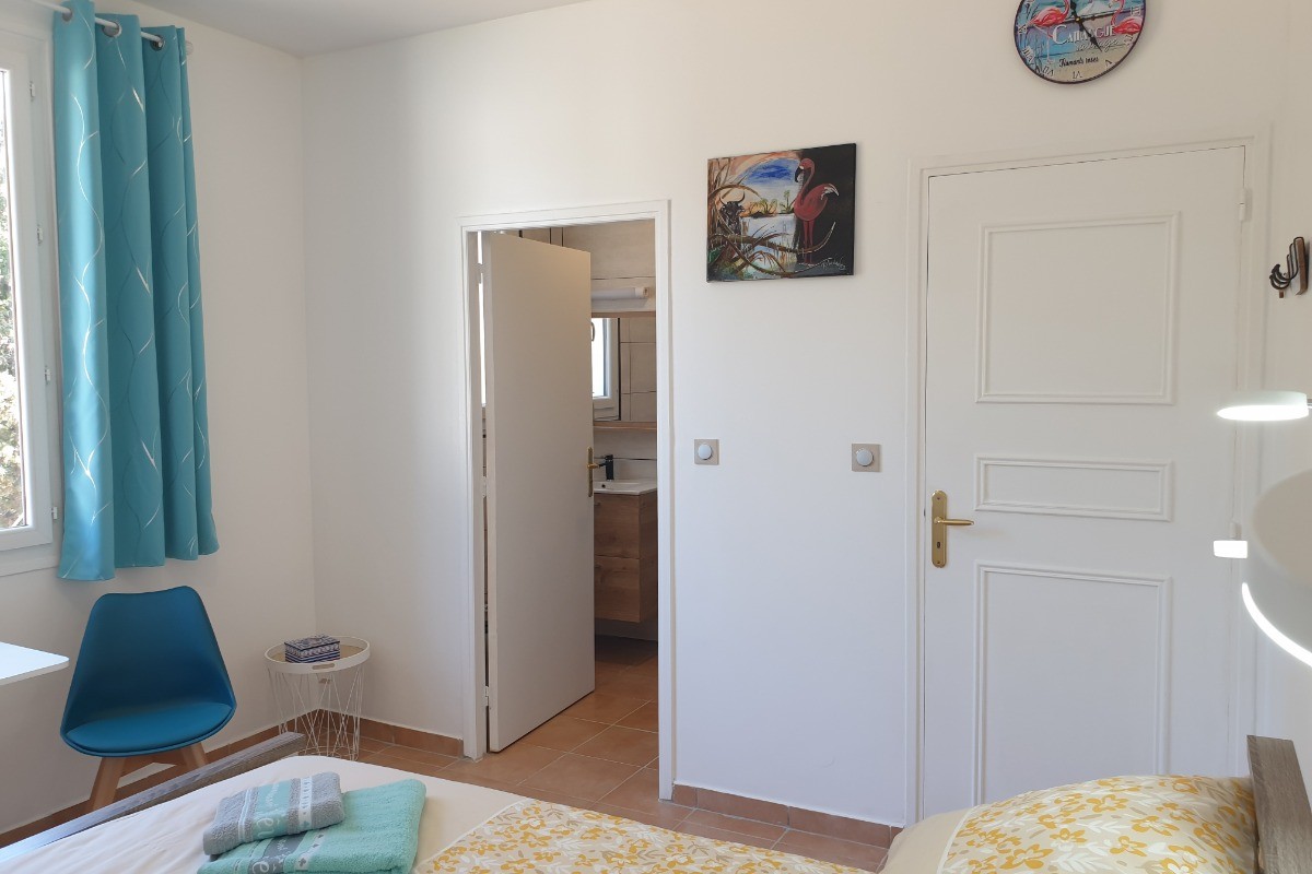 Chambres doubles à l’étage dans propriété atypique avec salle d’eau et wc privés. Entrée privative aux deux chambres. Chambre Camargue : Lit 140*200. Vue chevaux. Chambre Provence: lit 140*190. Sdb séparée par une cloison et un rideau. Parking privé. AndroidTv. Netflix. Internet par fibre. Plateau de courtoisie. Barbecue/Plancha. Prêts de livres. Piscine en saison. Sur place : chiens, chat, chevaux. En campagne au calme. Mer et rivière à proximité. Serviettes et draps fournis. Petits déjeuners complets inclus. Possibilité repas. Possibilité soins aux chevaux et découverte de l’équitation.