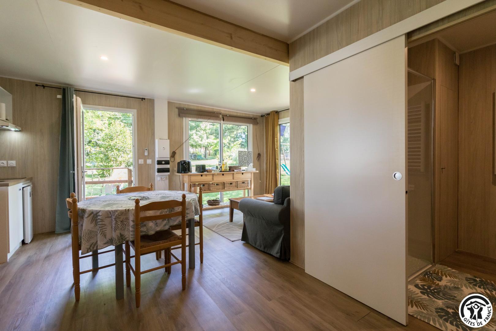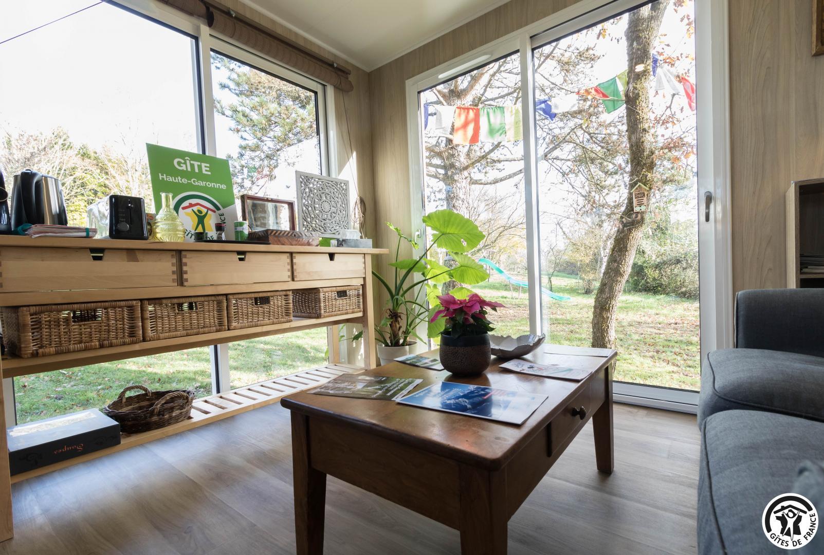 Built in wood, the bay windows of this unusual accommodation will bathe you in light. The first level comprises a large living room (fitted kitchen, sitting area, dining area and 90x190cm single bed) and a shower room with WC (easy access). The 140x190cm double bed is located on the mezzanine floor (steep staircase) and opens onto a small balcony, perfect for enjoying the Lauragais countryside and the Pyrenees mountain range.