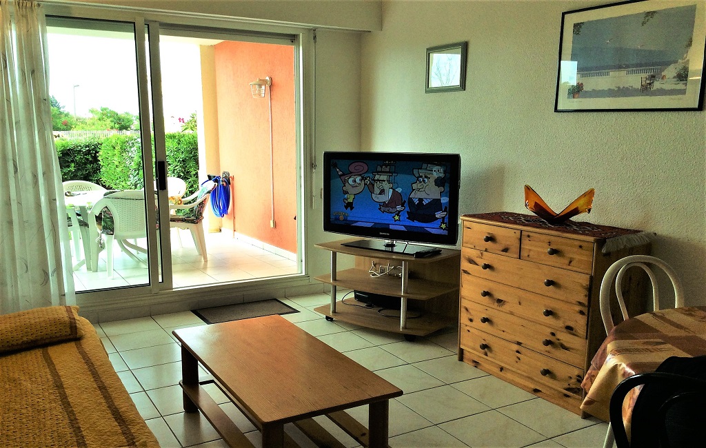 Terrace with reclining chairs. Private garden with direct access to the pool. View of flower garden.