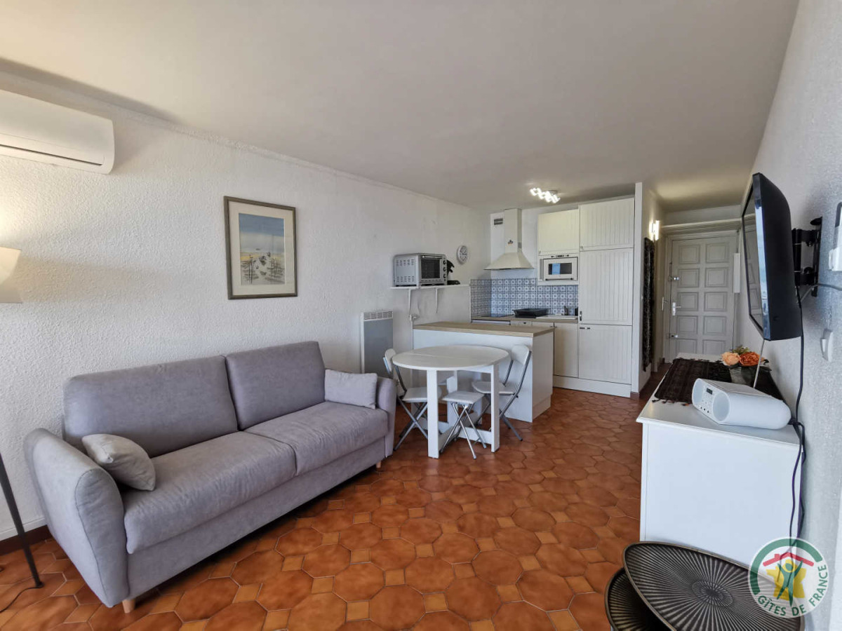 Vous rêvez de vous réveiller avec le bruit des vagues et une vue imprenable sur la mer ? Bienvenue aux Coquilles. Ce charmant appartement climatisé vous offre tout le confort pour un séjour détente en bord de mer: – Une pièce à vivre lumineuse avec une cuisine entièrement équipée (plaques à induction, four-grill, micro-onde, lave-vaisselle, cafetière Tassimo), un espace repas et un coin salon convivial avec canapé convertible (140×190). – Une terrasse de 7m² aménagée, idéale pour savourer votre café du matin ou vos repas face à la mer. – Une chambre avec lit double (160×200) et sa deuxième terrasse avec vue mer. Situé au 2e étage avec ascenseur, l’appartement dispose d’une place de parking privative au sein de la résidence sécurisée. Possibilité de réserver le ménage et les draps en option. À découvrir aux alentours : Cap d’Agde, Marseillan, Sète, l’étang de Thau et ses parcs ostréicoles, Béziers, Pézenas, le Canal du Midi… Sans oublier les plages et les nombreuses activités nautiques !