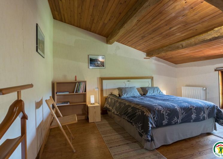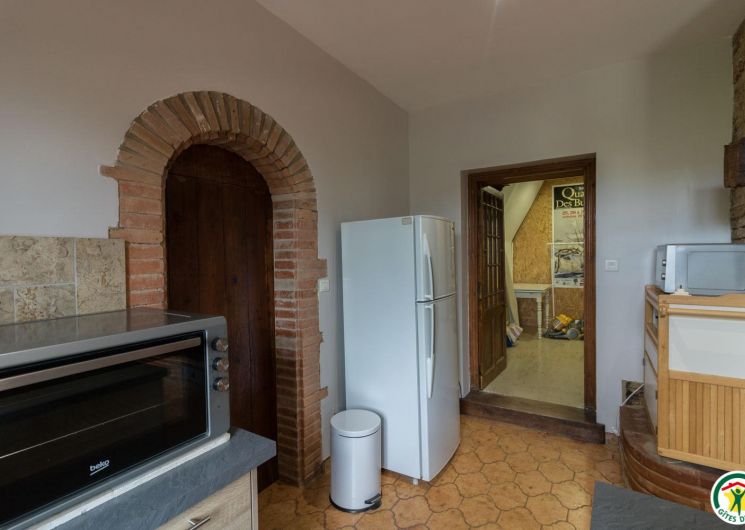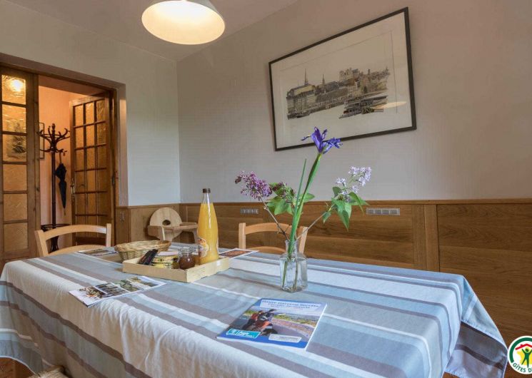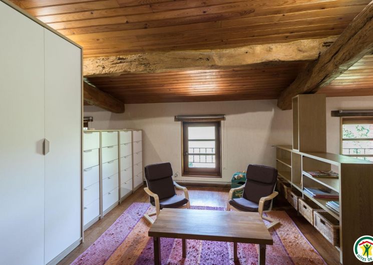 Upstairs: large lounge (sofa, flat-screen TV, DVD player, HI FI radio, 140cm extra bed), large bedroom with 1 160cm double bed and 2 90cm single beds, separated by a children’s play area. WC and washbasin. Oil-fired central heating. Garden furniture, deckchairs, parasol and barbecue. This gîte is adjoining the owners’ house (but not overlooked). Baby equipment (cot and high chair). Shared garden, not enclosed. Pets not allowed. Internet access. Possibility of teleworking.
