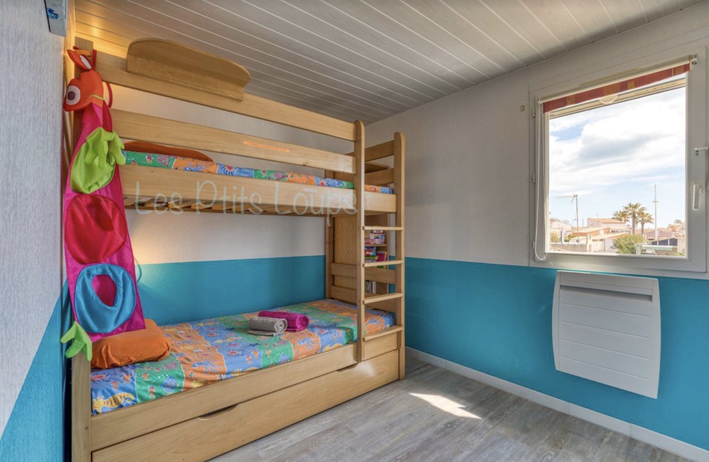1st bedroom: 1 large mezzanine bed (140×200) and a BZ (140) underneath, 1 cupboard.