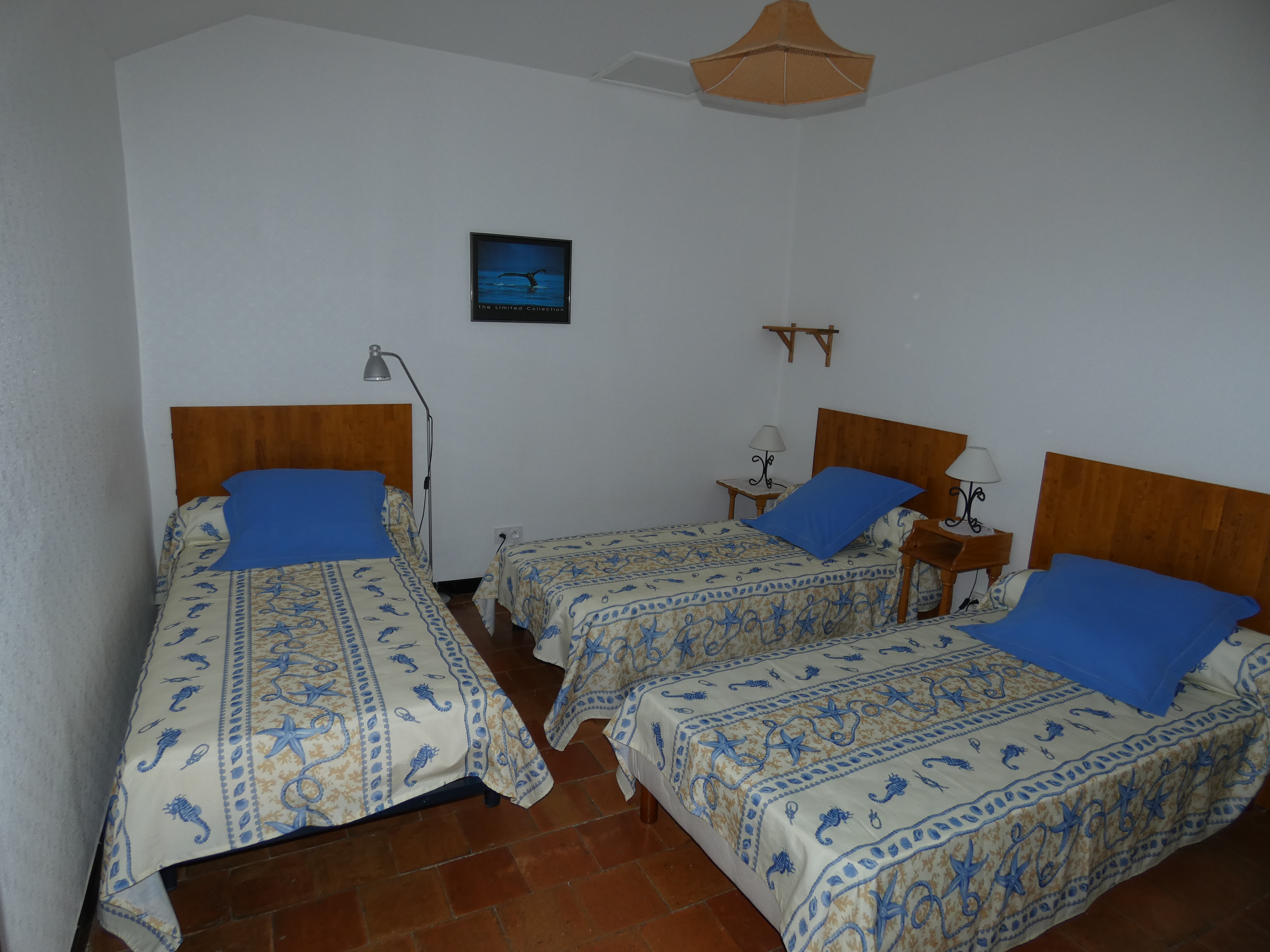 This accommodation comprises a kitchen/dining area (with a grill-oven, microwave and filter coffee maker), a shower room and separate toilet, a double bedroom with a 160×200 bed, and another bedroom with three 90×190 single beds.
