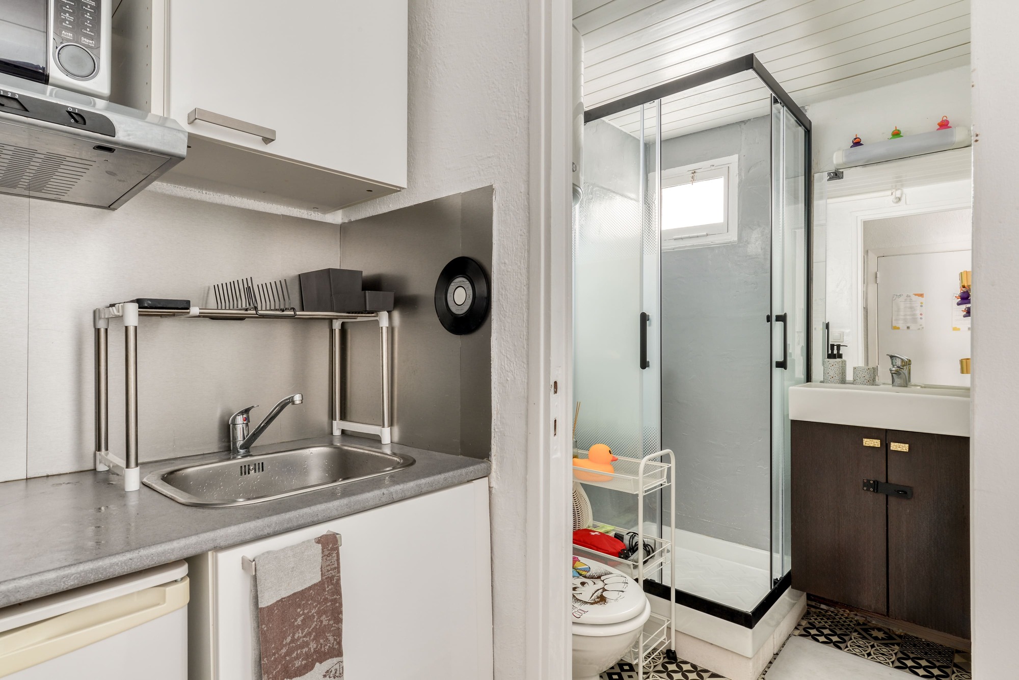 Located on the 3rd floor without elevator, this small studio comprises a bright living room with a large wall-mounted dressing room, a small table and two chairs, as well as a fully-equipped kitchen and a shower room with toilet.