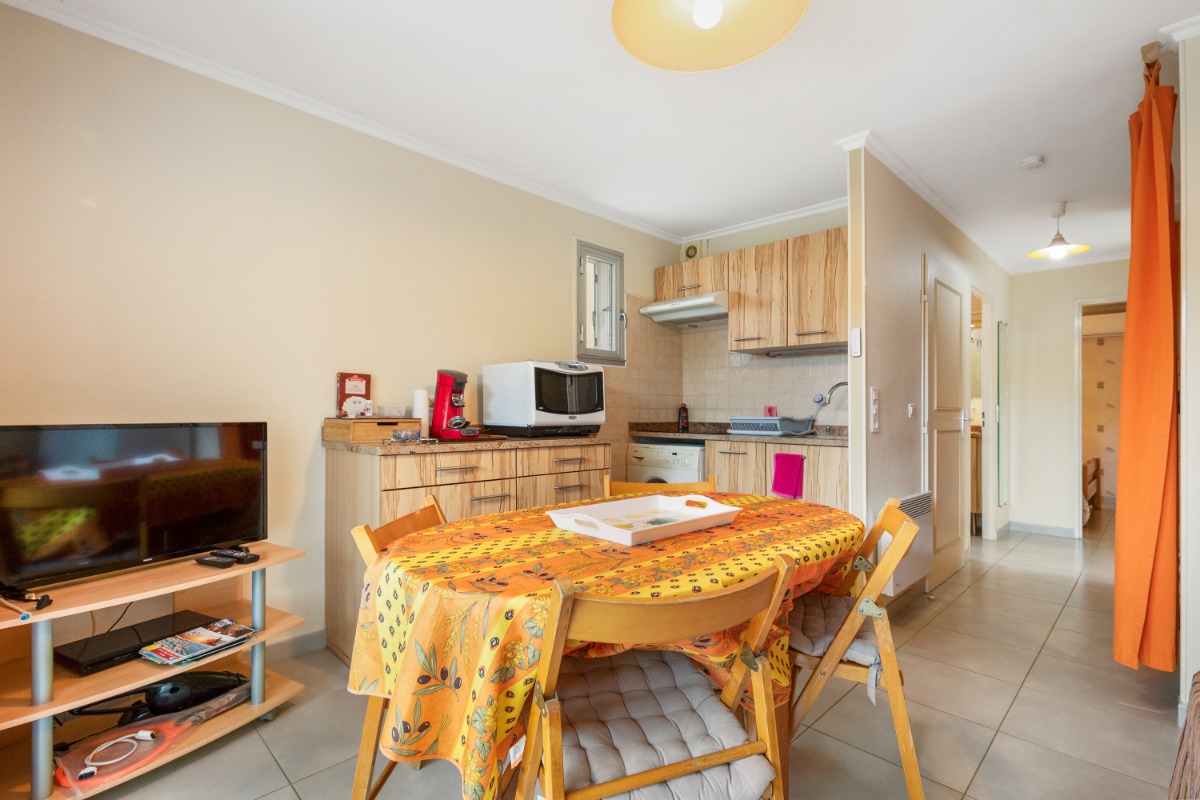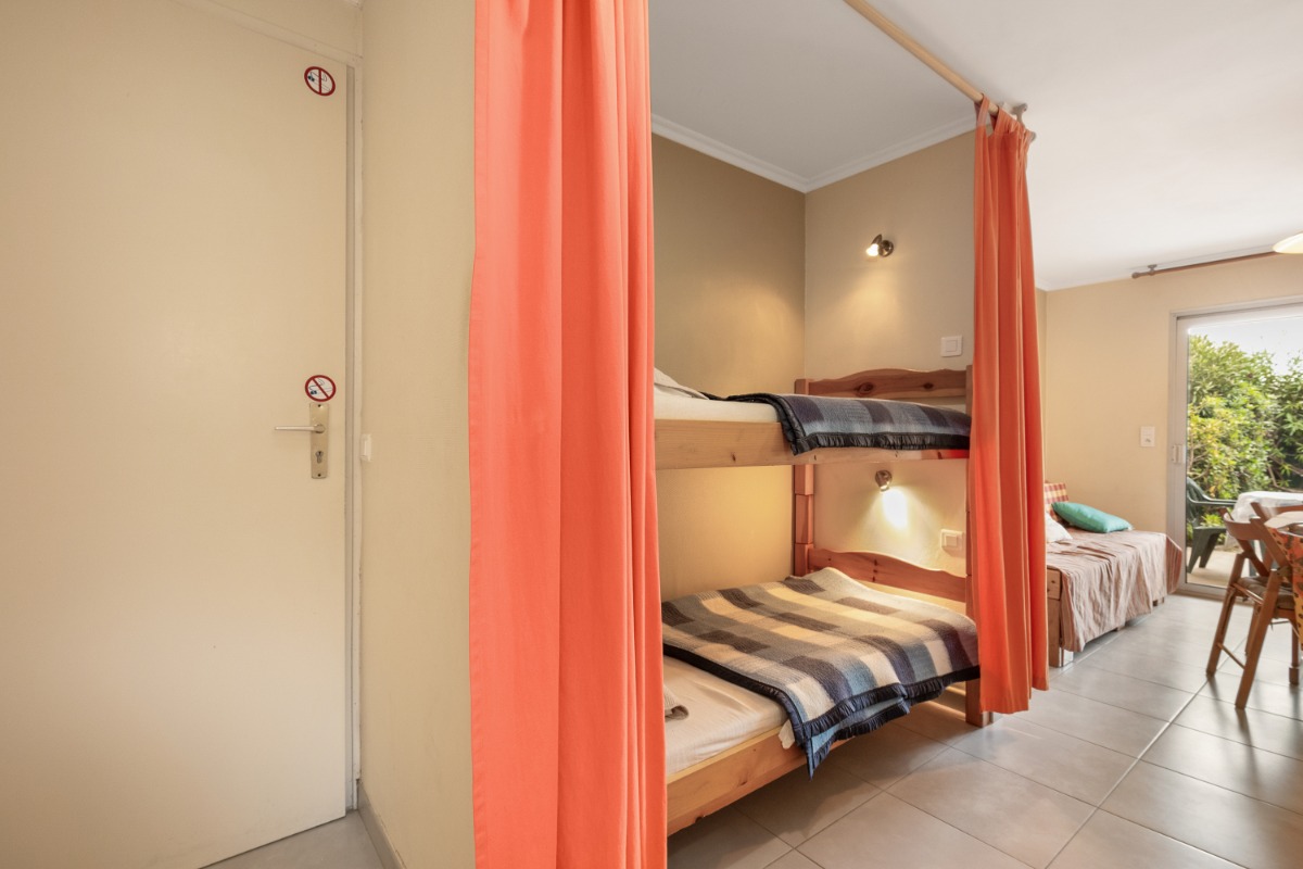 Il dispose d’une chambre avec lit en 140 cm, d’un coin cabine avec 2 lits en 90 cm, d’un salon/séjour avec canapé convertible, TV, TNT, DVD, Wi-Fi.