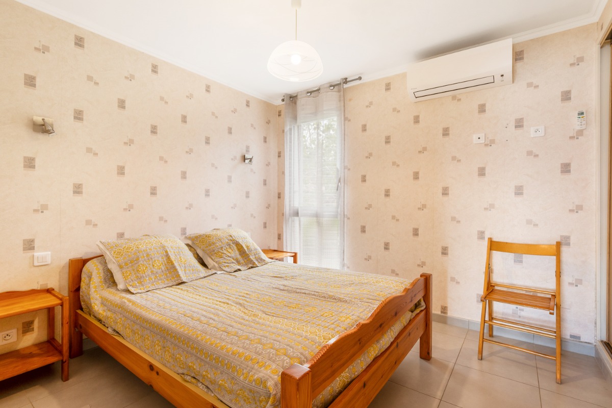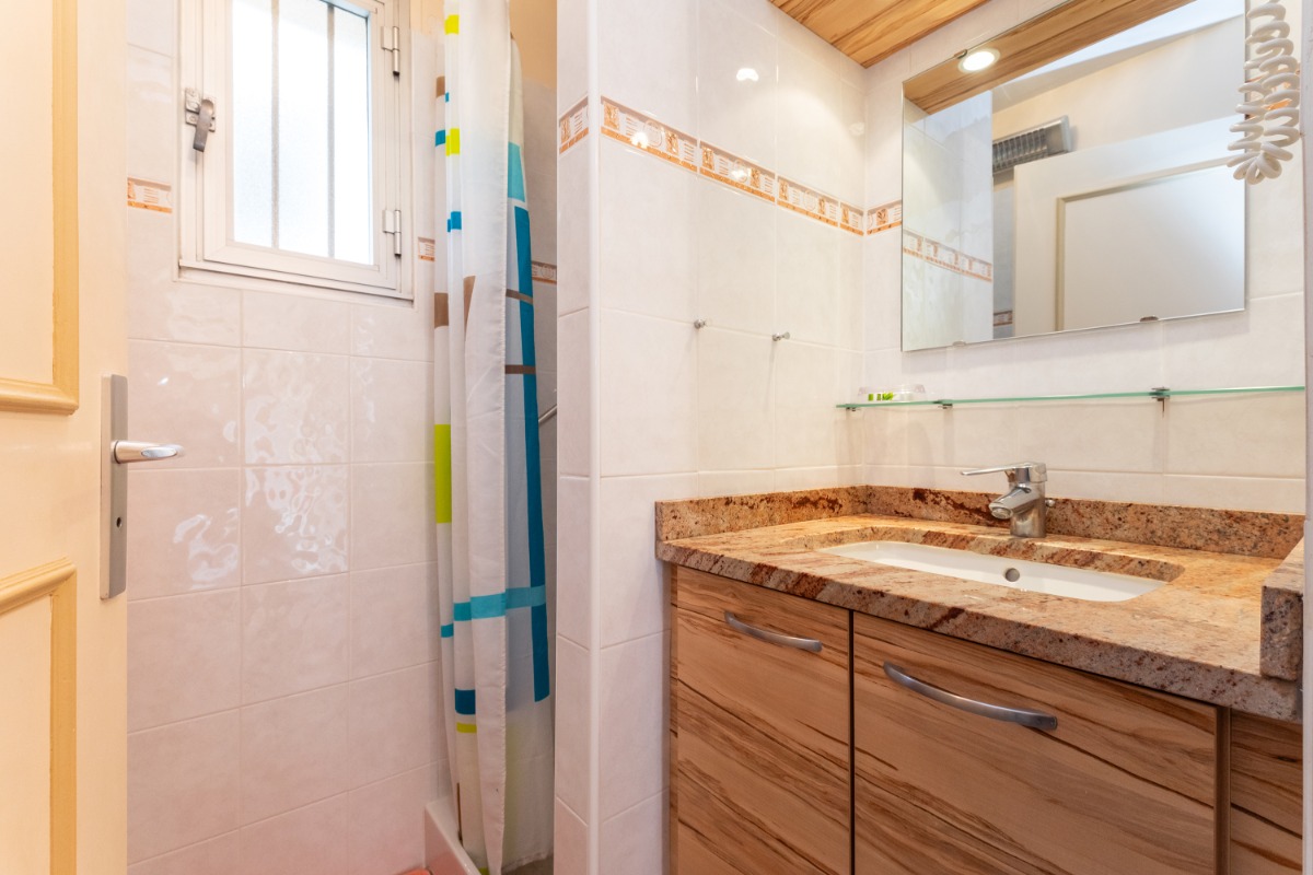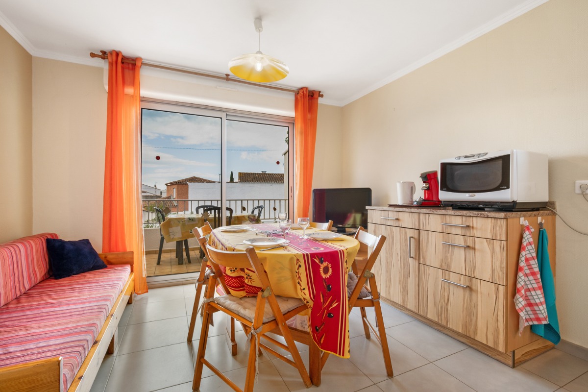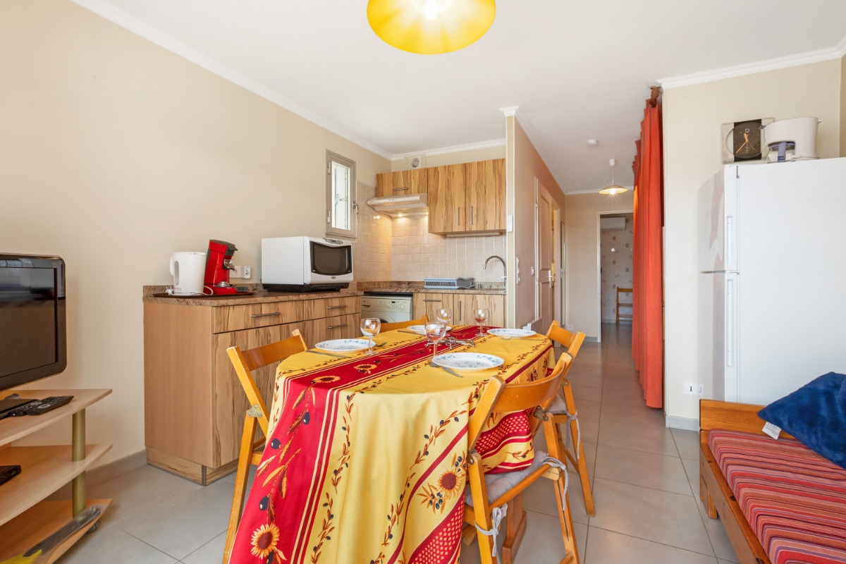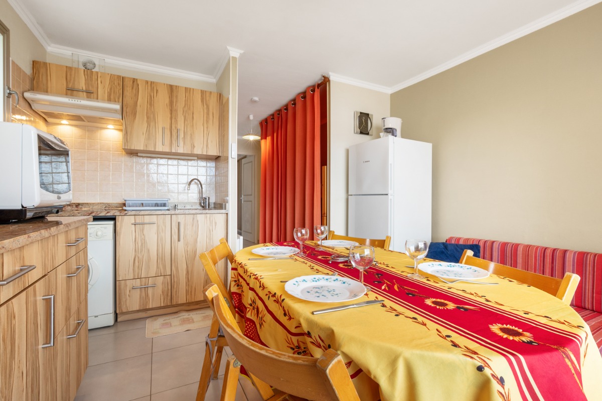 This 30 m² air-conditioned apartment on the 1st floor can accommodate 5 people. It features a bedroom with 140 cm bed, a cabin area with 2 90 cm beds, a shower room with hairdryer, a living area with sofa bed, TV, DVD, TNT and Wi-Fi.