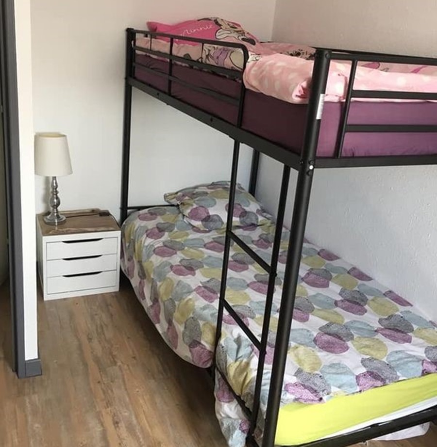 There’s a brand-new 2-person sofa bed in the living room, and 2 bunk beds in the separate bedroom.