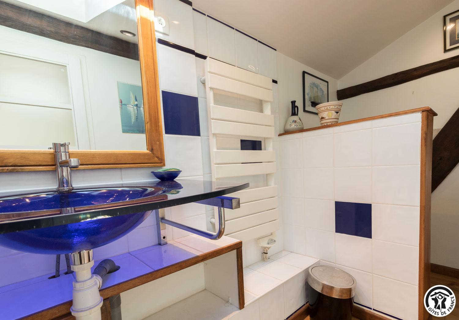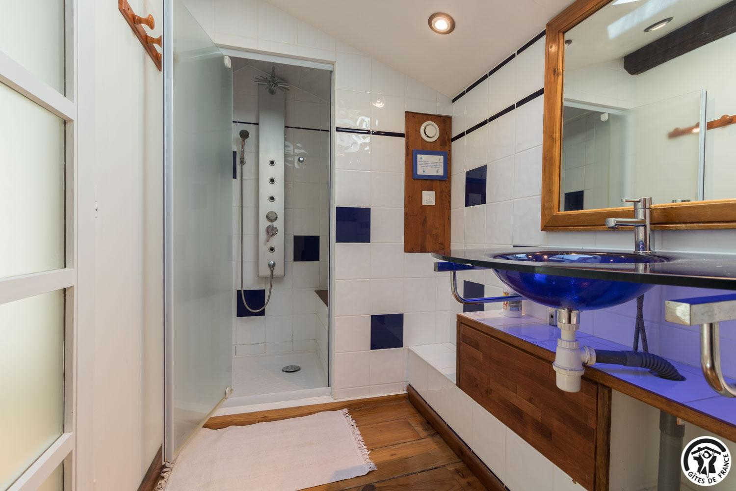 – upstairs: bedroom 1 (1 double bed 140cm + 1 children’s bed 80cm) – bedroom 2: (2 double beds 140cm + 1 children’s bed 80cm) separated by a shower room (shower with jets and washbasin), bench. Shower room (jet shower) with WC.