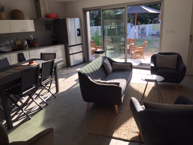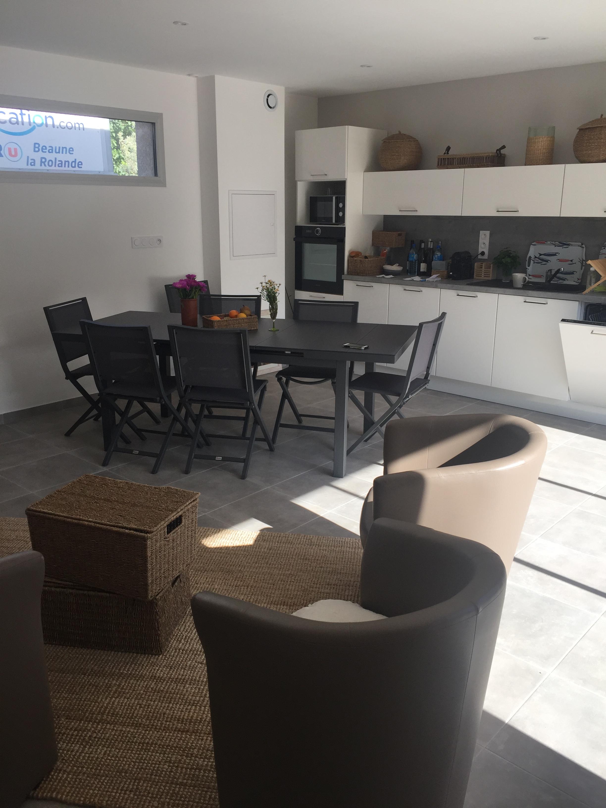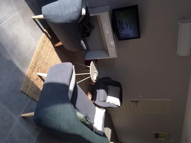 Salon, cuisine aménagée, coin TV. Cuisine entièrement équipée.
