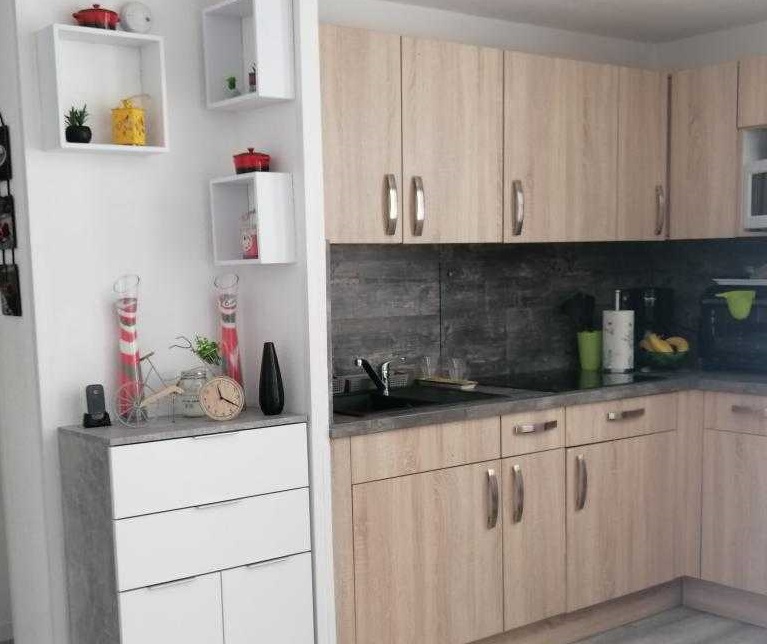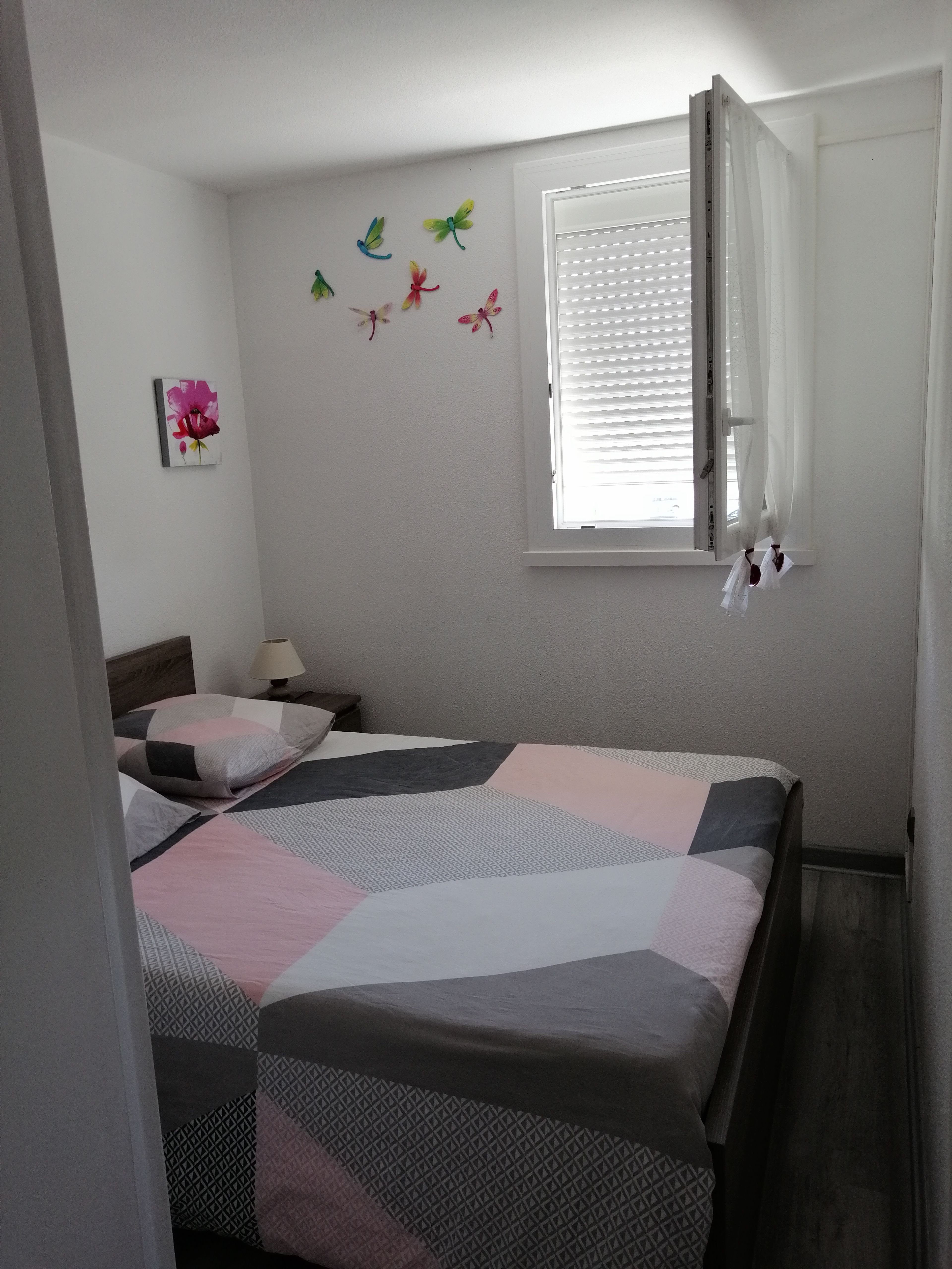 Composed of an entrance opening onto a living room with 1 corner sofa bed, a fully equipped kitchen and a loggia/balcony with table and 6 chairs, large-screen wall-mounted TV. Electric shutters and double glazing.