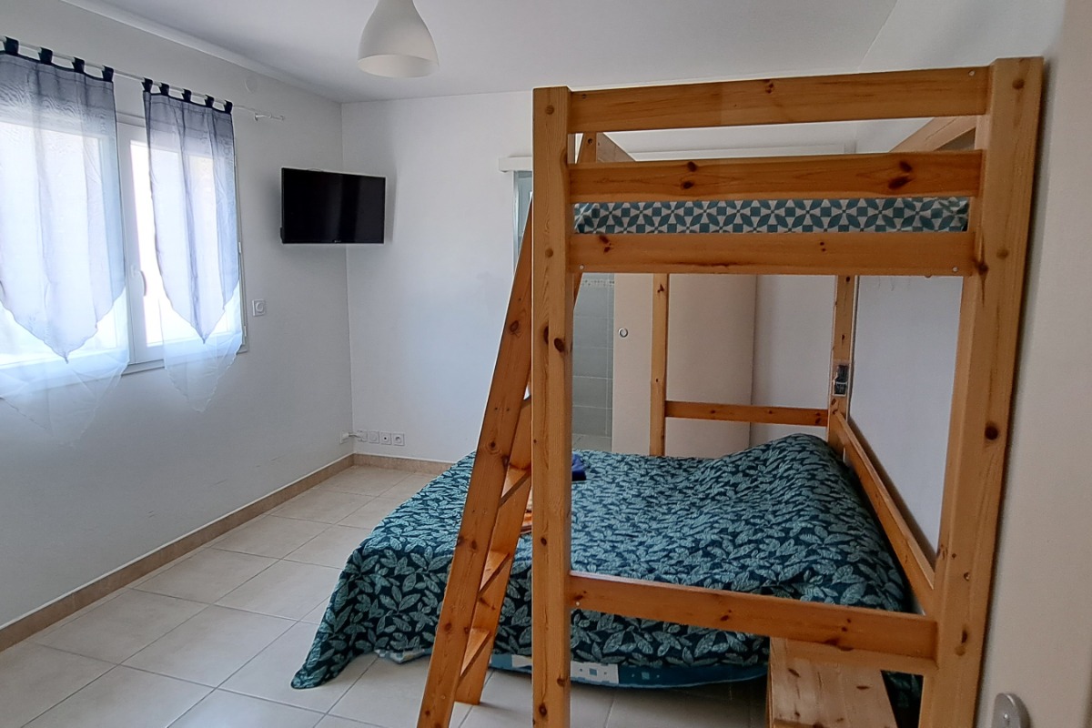 The bedroom configurations are as follows: one with a 90 cm bed and a 140 cm bed, another with a 160 cm bed, a third with a 90 cm bed and a 140 cm bed, and finally a bedroom with a 140 cm bed and 2 90 cm beds. Two separate toilets are also available, one on the day side and one on the night side.