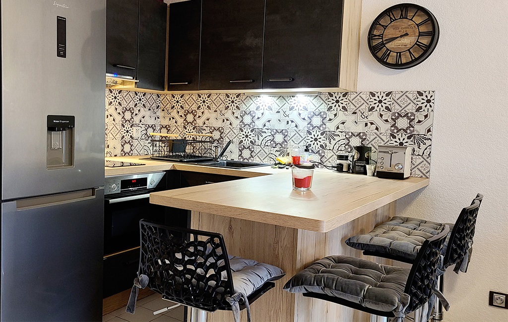 Inside: 1 open-plan living area with large bay windows. 1 “Rapido” sofa bed, TV unit and flat-screen TV. A fully-equipped open-plan kitchen. 1 bedroom with cupboard and 140cm bed. 1 shower room with walk-in shower and washing machine. 1 separate toilet.