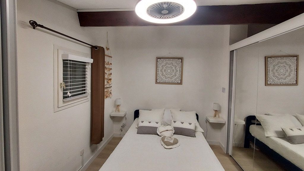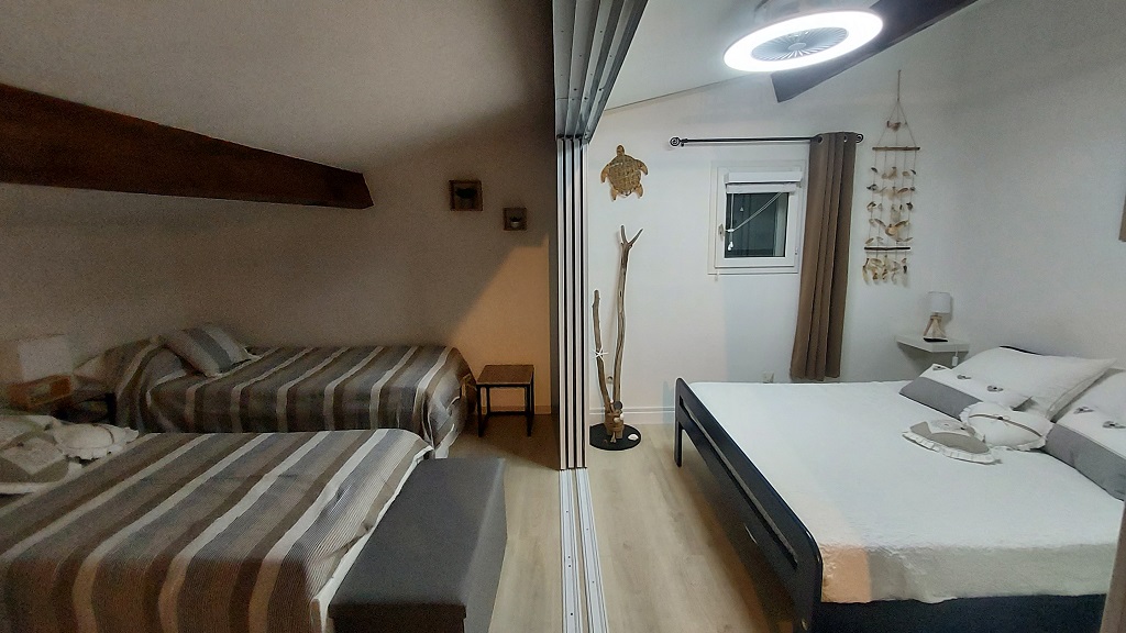 Completely renovated and very well equipped: 2 separate bedrooms (1 upstairs), 2 beds 90×190, fully-equipped veranda kitchen (dishwasher, washing machine, oven, microwave, etc.), reversible air-conditioning, baby equipment (cot), high chair.