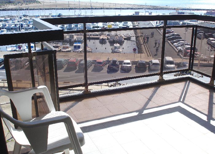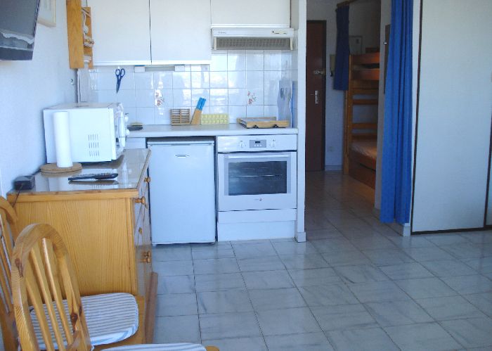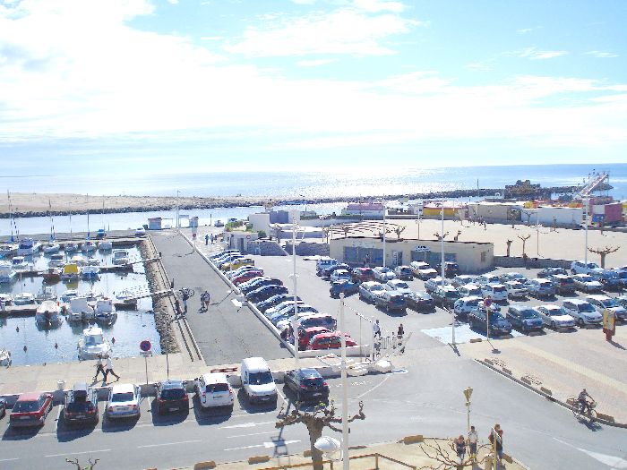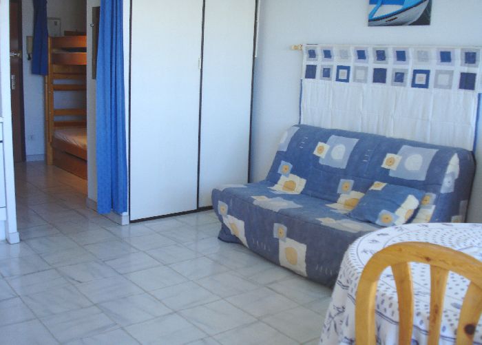 Studio cabine face au port, 2ème étage avec ascenceur. Une entrée cabine avec 2 lits superposés, salle de bains, wc séparé, une pièce avec un canapé lit BZ en 140, kitchenette équipé, téléviseur, terrasse avec très belle vue sur le port et la mer.