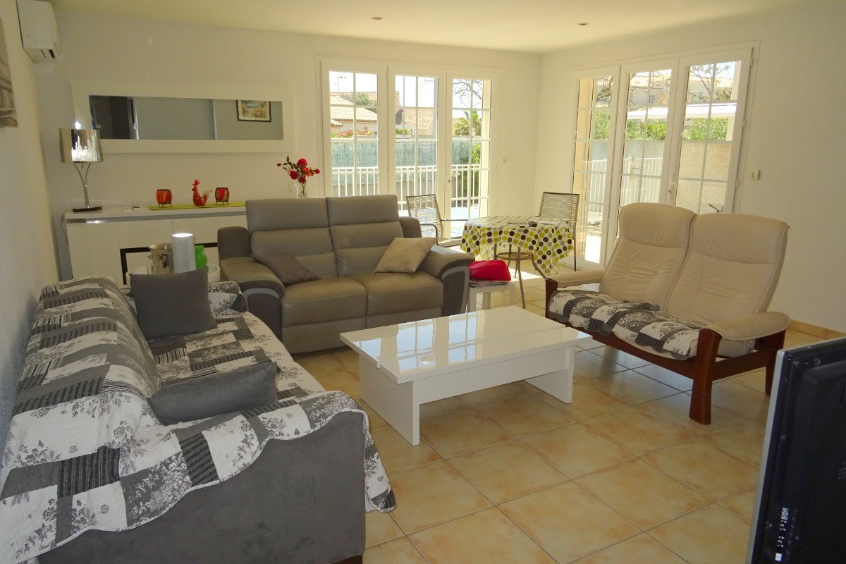 Découvrez cette belle villa de 130 m² sur un terrain de 505 m². Au rez-de-chaussée, elle offre deux chambres, l’une avec un lit en 140 et l’autre avec deux lits en 80, ainsi qu’une salle d’eau avec douche et des WC séparés. À l’étage, une troisième chambre avec un lit en 140 donne accès à un solarium, accompagnée d’une salle d’eau avec douche et WC. L’extérieur comprend une grande terrasse idéale pour les repas en plein air et une piscine privée où vous pourrez vous détendre en toute tranquillité. Il est possible de stationner deux véhicules directement sur la propriété. Cette villa dispose de tout le confort moderne, avec une télévision, un micro-ondes, un four, un lave-vaisselle, un lave-linge, la climatisation et le WiFi. Située à seulement 100 mètres de la plage, elle est idéale pour un séjour sous le soleil du Cap d’Agde. Animaux non admis. Référence : 422
