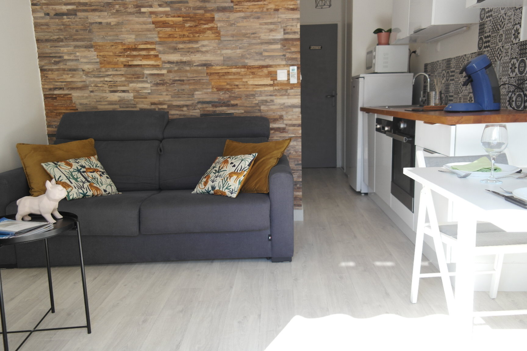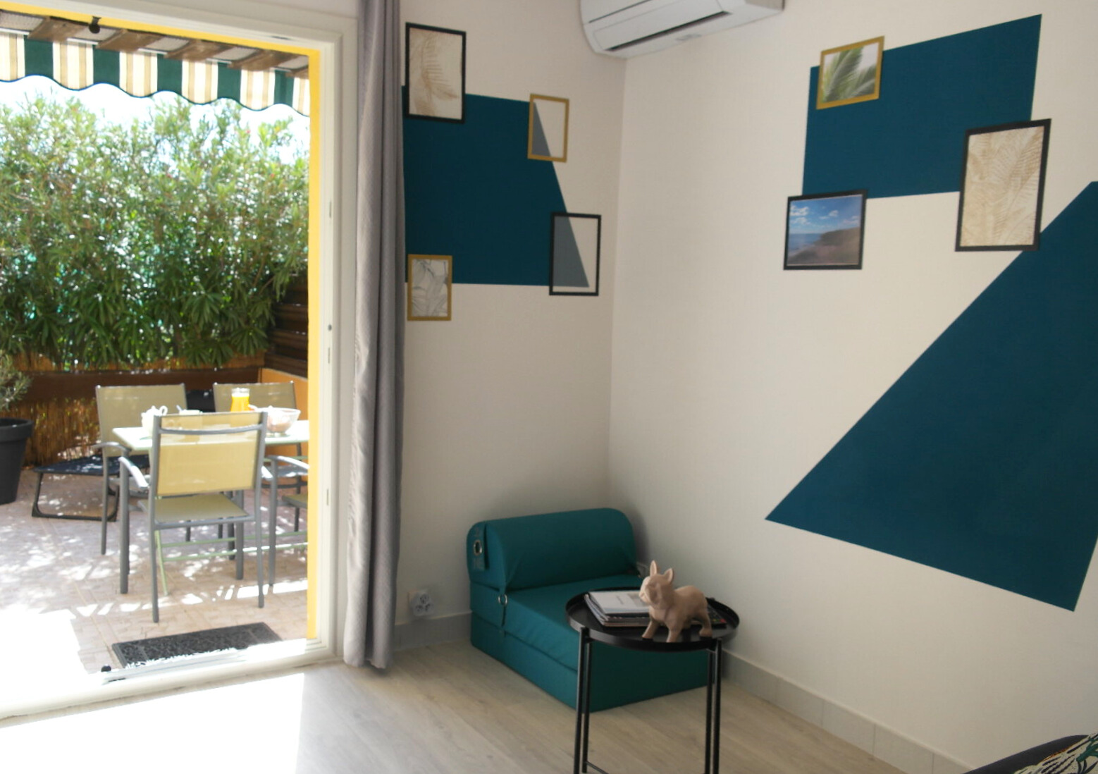 Closed, air-conditioned, refurbished studio cabin for 4 people, in a residence located in the Pinède district. 14 m² terrace.