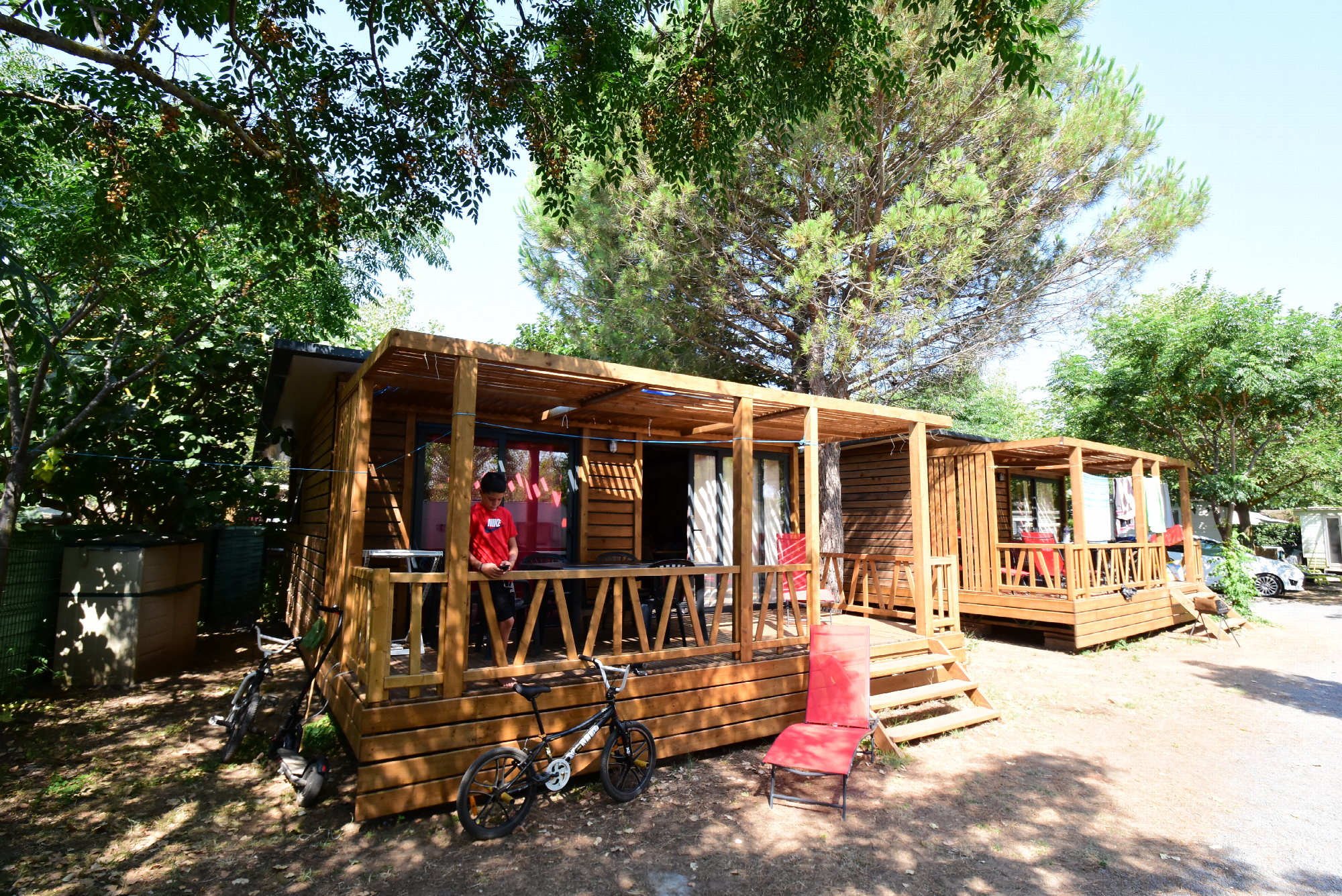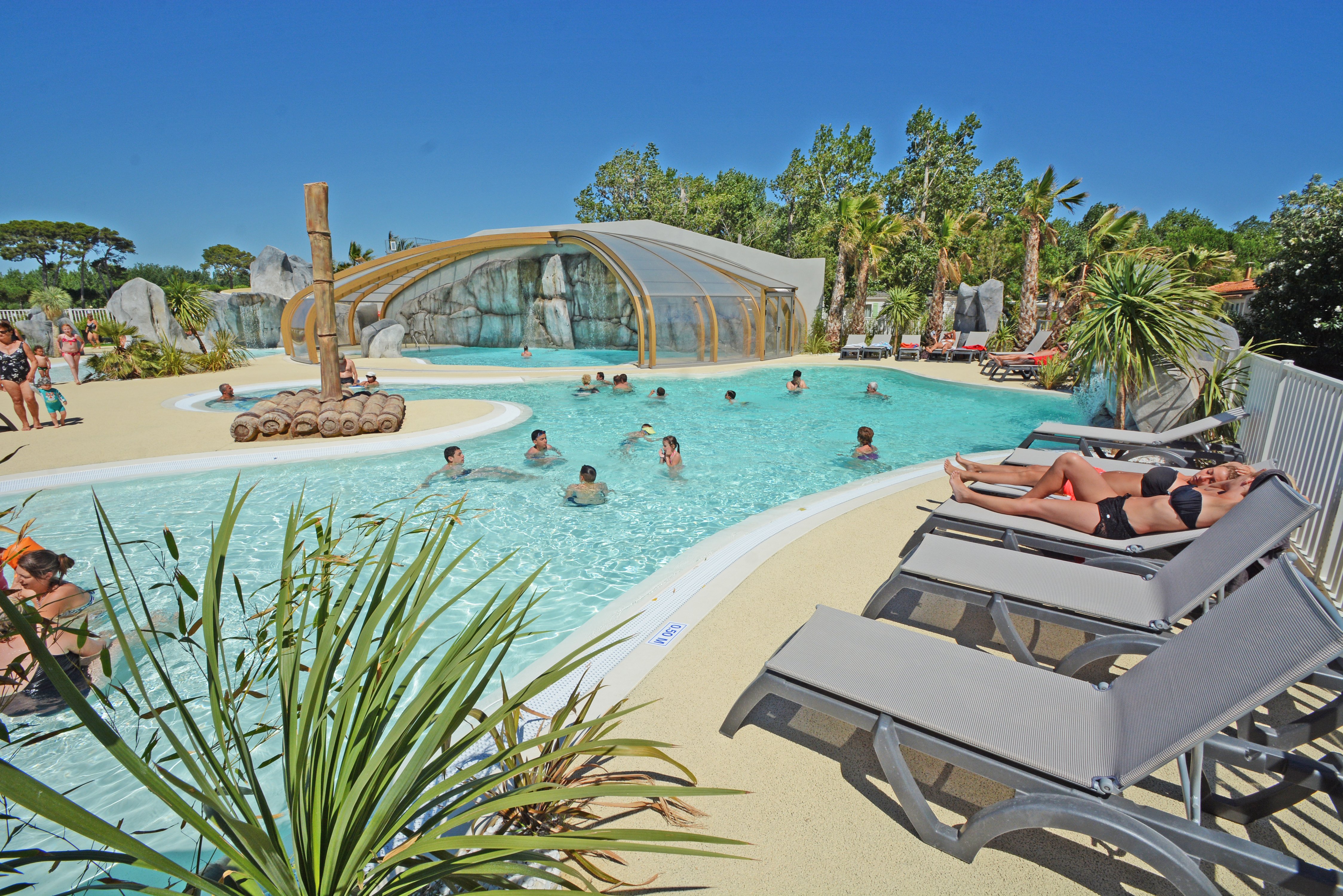 Shady pitches and quality mobile homes. Beautiful aquatic area with three pools, one of which is covered, slide and jacuzzi (heated water from opening).