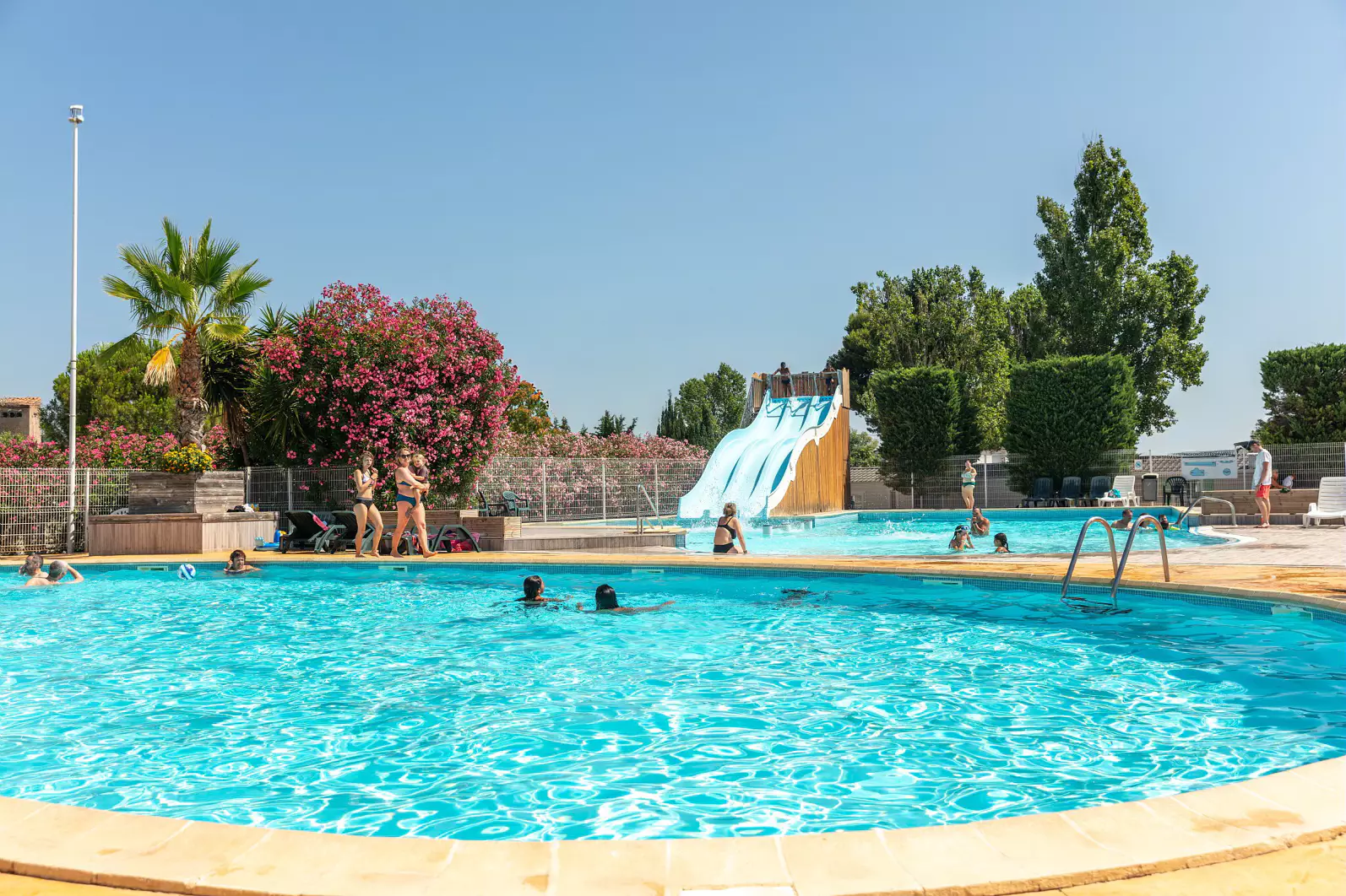 The Europe-Village Center campsite in Vic-la-Gardiole is a family campsite situated midway between the towns of Sète and Montpellier, just five minutes from the beach at Les Aresquiers. The campsite offers rented accommodation on a 5 hectare site comprised of 150 fully equipped mobile homes, (kitchen, bathroom, WC), 40 chalets and 50 traditional pitches for tents, caravans and camping cars. All of our rented accommodation features a covered wooden terrace and a spacious, clearly marked out plot. During the summer season, a free beach shuttle service is provided and our team of organisers prepares activities for guests of all ages. Pool area with slide. Small daily market on the campsite. Nearby: equestrian farms, acrobranche (tree climbing) and beaches.