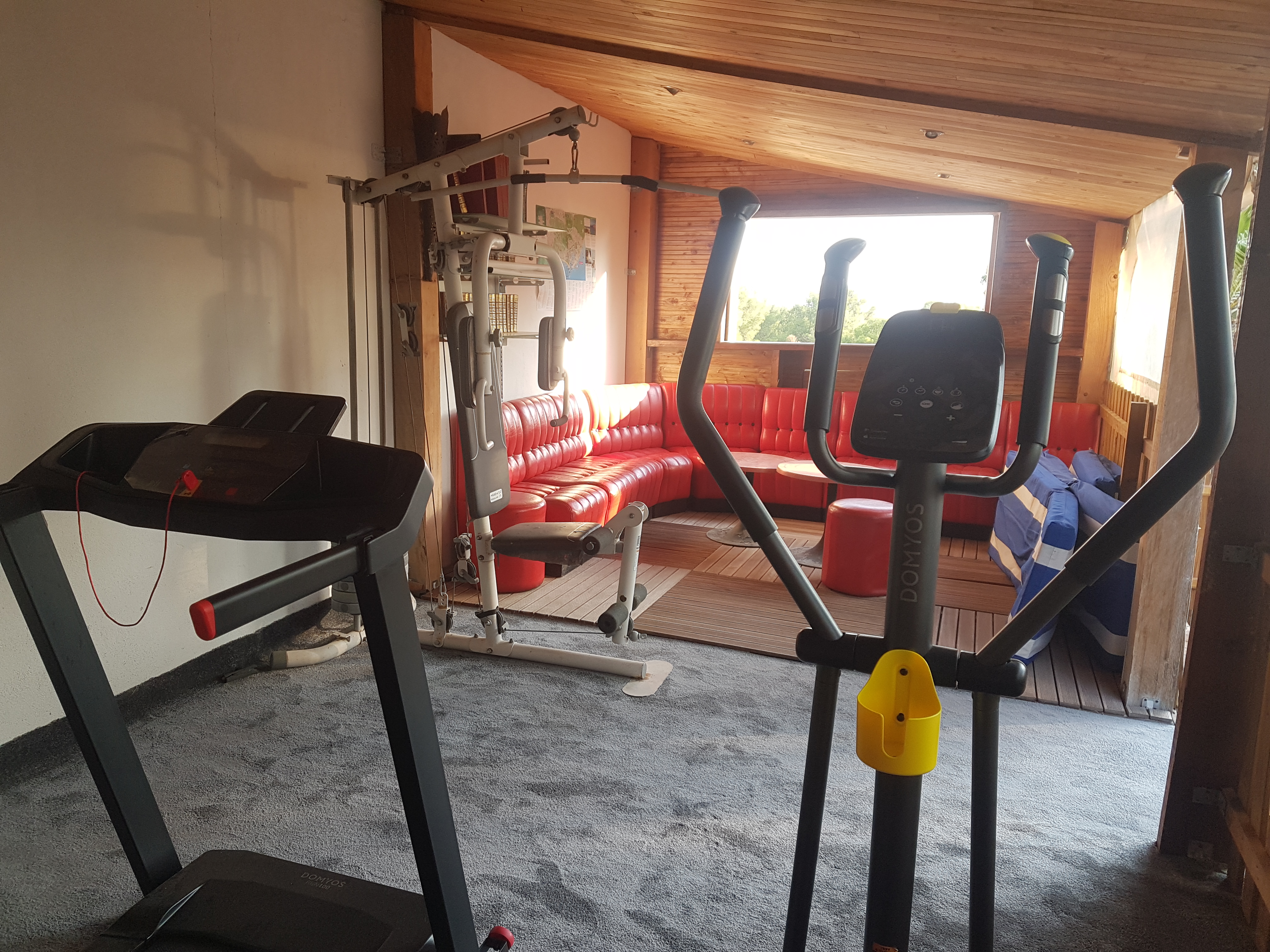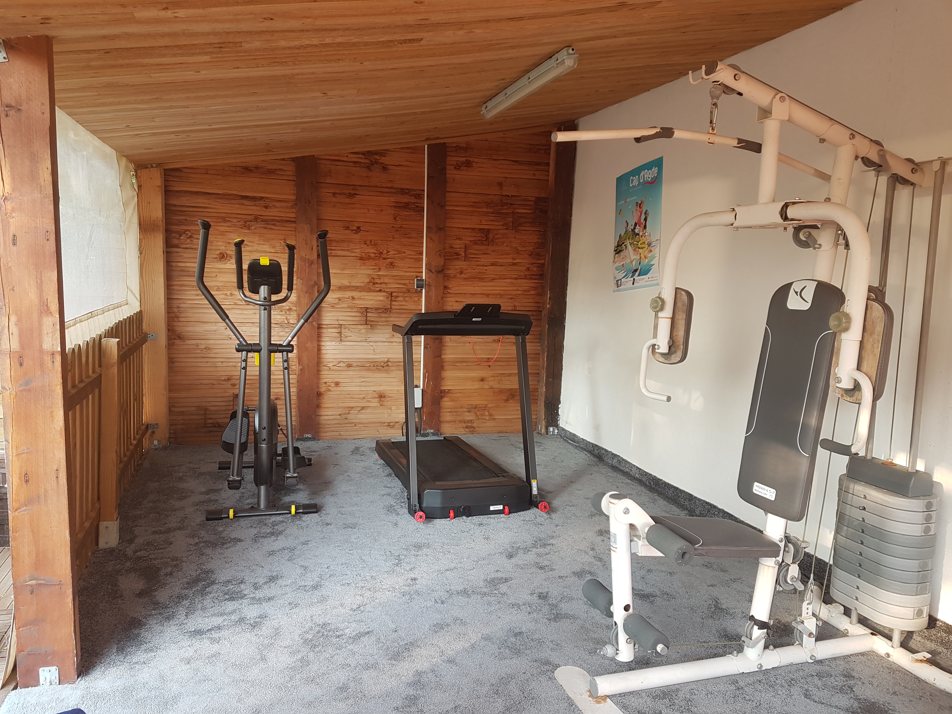 Fitness room with treadmill, elliptical trainer and weight bench.