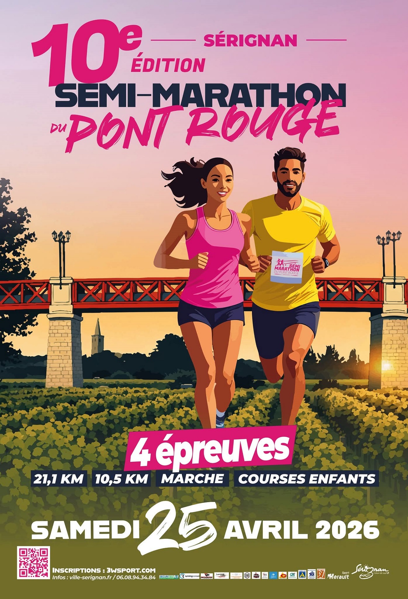 Rendez-vous le samedi 25 avril pour souffler les 10 bougies du Semi-Marathon du Pont Rouge ! Que vous soyez un coureur chevronné en quête de performance ou un marcheur souhaitant profiter des paysages de Sérignan, cet événement propose des épreuves adaptées à chacun :