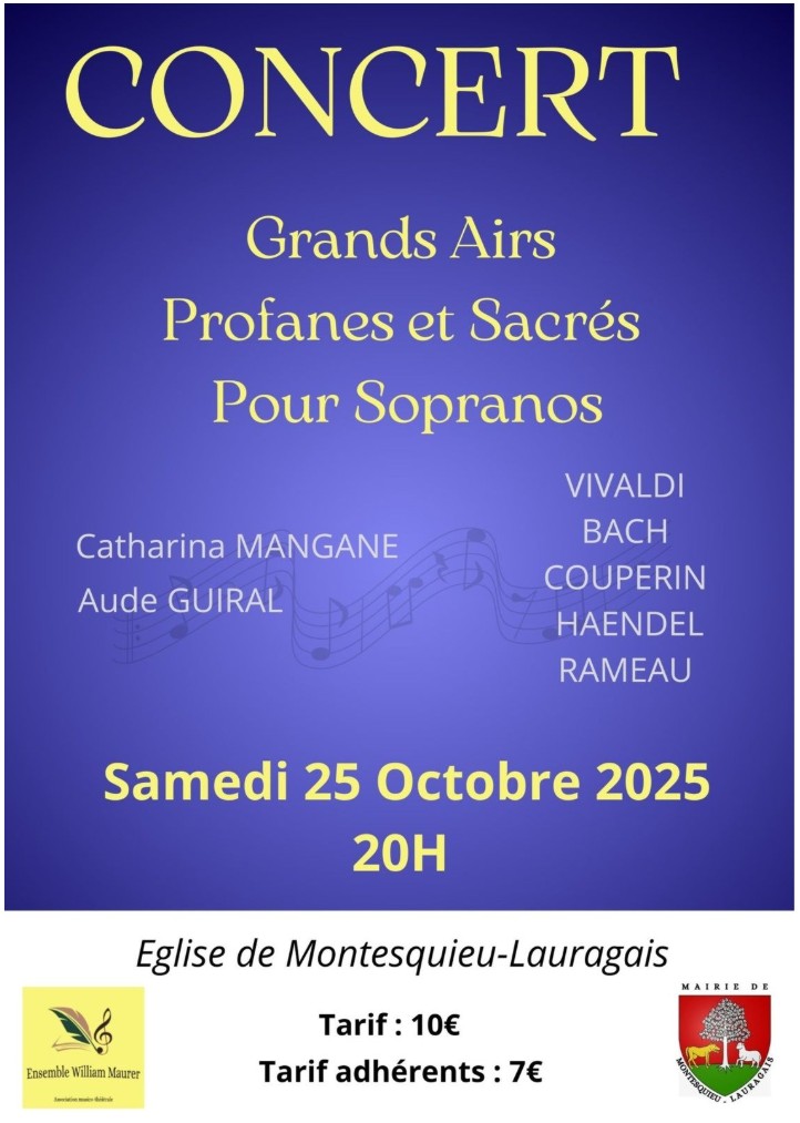 Vous assisterez à un concert où vous entendrez les deux sopranos Aude GUIRAL et Catharina MANGANE chanter de grands airs du répertoire sacré ou opératique, accompagnées de quelques instruments. Au programme, vous entendrez entre autres des œuvres de Vivaldi, Bach, Haendel et vous découvrirez également une création originale de notre directeur artistique.