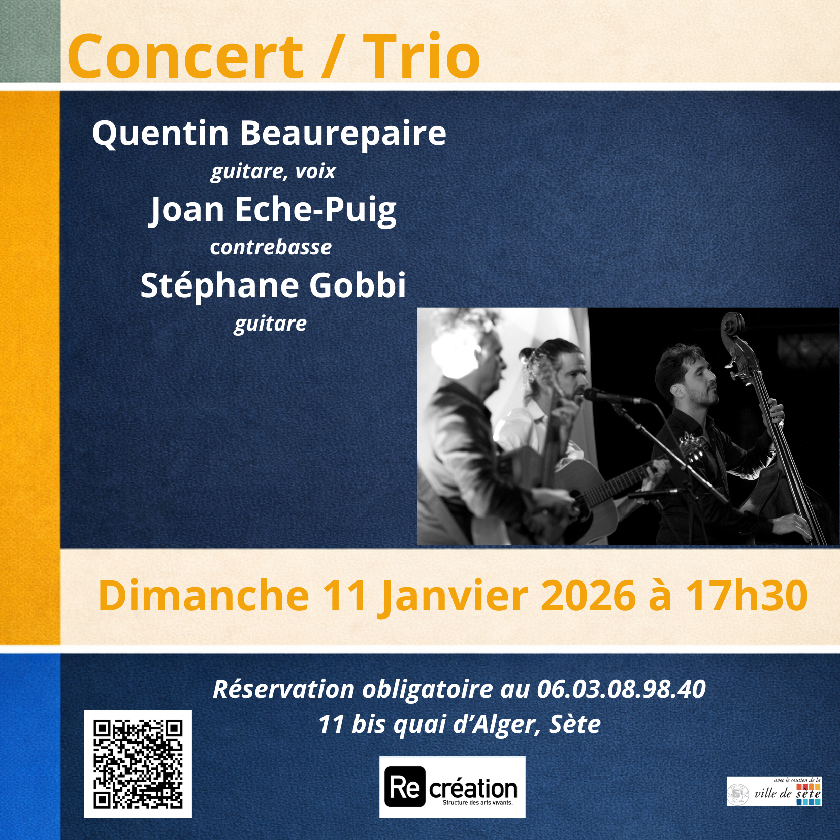 Quentin Beaurepaire ( guitare, chant ), Joan Eche-Puig (contrebasse), et Stéphane Gobbi ( guitare )présentent leur répertoire de compositions dans lesquels les textes, intimistes et universels à la fois,voyagent au gré des méandres de l’âme, où la poésie côtoie le désir, où la douceur côtoie l’espoir, où lamusique respire les multiples cultures qui font la richesse des couleurs de l’humanité