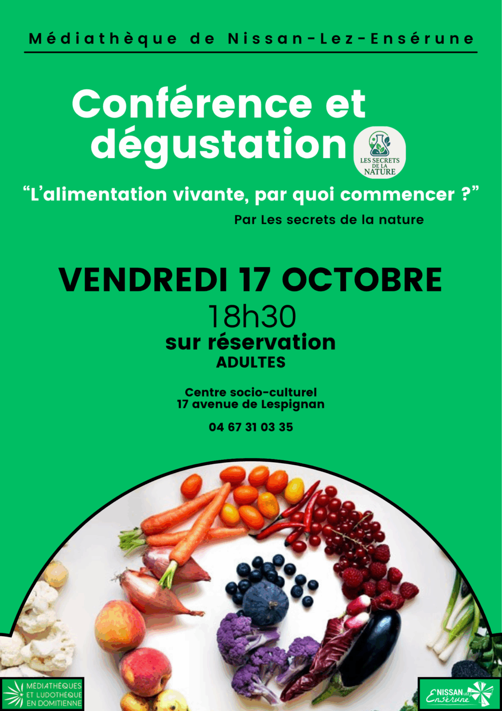 CONFÉRENCE ET DÉGUSTATION « L’ALIMENTATION VIVANTE, PAR QUOI COMMENCER? » 17 Avenue de Lespignan34440 NISSAN-LEZ-ENSERUNE