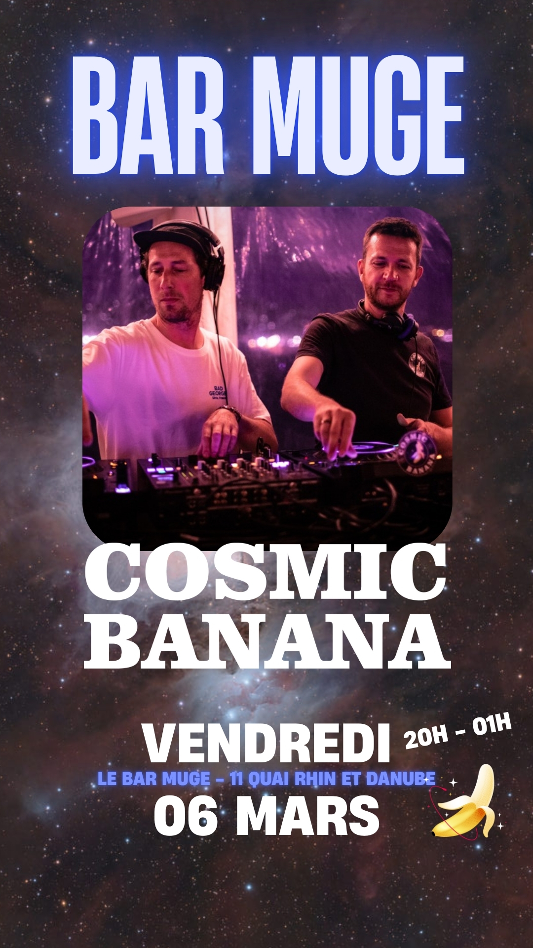Le vaisseau Cosmic Banana se pose au Bar Muge le temps d’une soirée.Naviguant entre Disco et Electro, House et Techno, avec comme seul objectif de vous faire groover toute la nuit en mettant le dancefloor sur orbite.