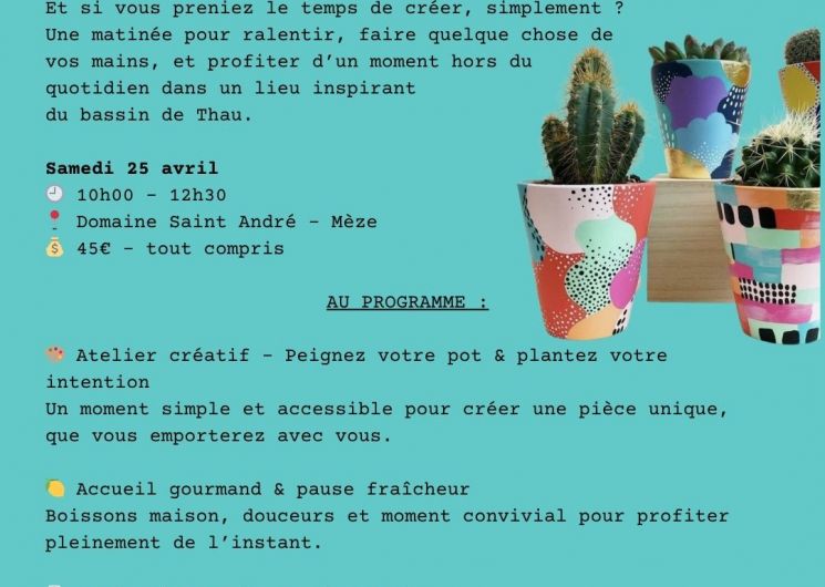 Un moment pour soi, pas pour le reste du monde.On passe nos journées à gérer, organiser, penser à tout…Et si, pour une fois, tu faisais juste quelque chose pour toi ?Le 25 avril, on te propose une parenthèse simple et cool 😕 créer quelque chose de tes mains? profiter d’un lieu canon? découvrir un domaine et partager un moment différentPas besoin d’être créative.Juste d’avoir envie de faire une pause.AU PROGRAMME:* Atelier créatif (pot + plante)* Pause gourmande* Visite du Domaine & dégustation de vin? Domaine Saint-André – Mèze? 10h00 – 12h30? 45€ tout compris⚠️ Places limitées? Infos & réservations obligatoire par téléphone ou via le lien d’inscription: https://forms.cloud.microsoft/r/wQMHgqzKsp(Gooo… ça va partir vite ?)✨ Parenthèses Nérolie#ateliercreatif #momentpoursoi #femmes #creativeevent #domaine